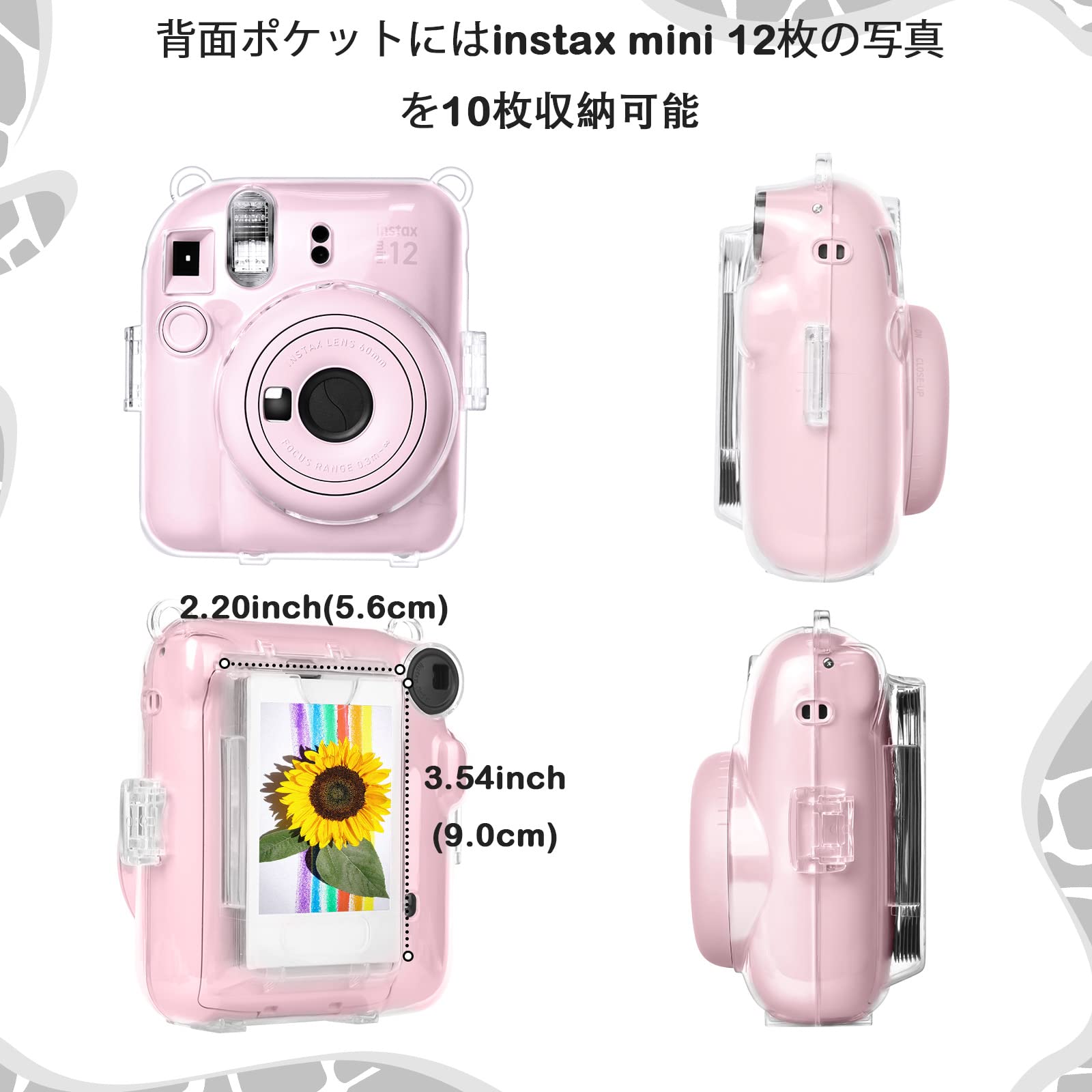 HIYQIN mini12 ケース 富士フイルム Instax Mini 12 カメラ用保護クリアケース クリスタルハードシェルカバー ショルダーストラップ付き カメラステッカー