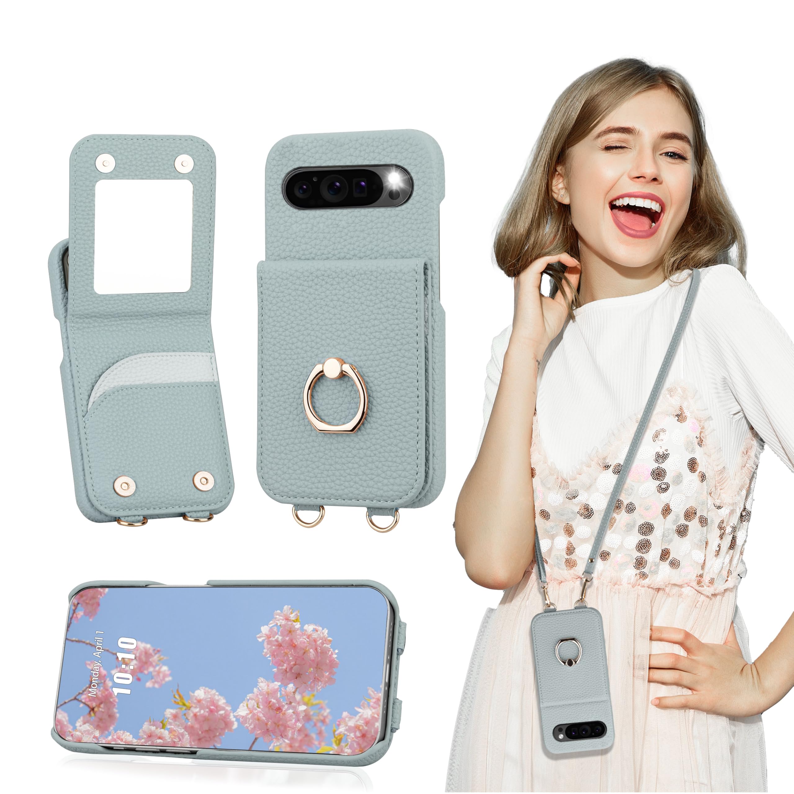 For Google Pixel 9/9 Pro ケース 手帳型 グーグルピクセル9 ケース ショルダー Google Pixel 9 カバー 手帳型 Googleピクセル9 Pro ケース 肩掛け 斜め掛け(長さ調整可能) 背面カード収納 化粧鏡付き スタンド機能(リング付き) Pixel9 ケース ミラー付き (オータムブルー)