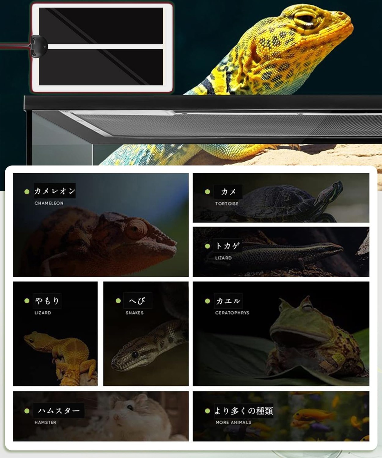 【適用対象】:カメ、トカゲ、カエル、サソリ、クモ、ヘビ、ハムスター、ウサギ、ネコなどの動物に適用です。ペットの体温調節、食欲増進、新陳代謝と消化を促進することができます。