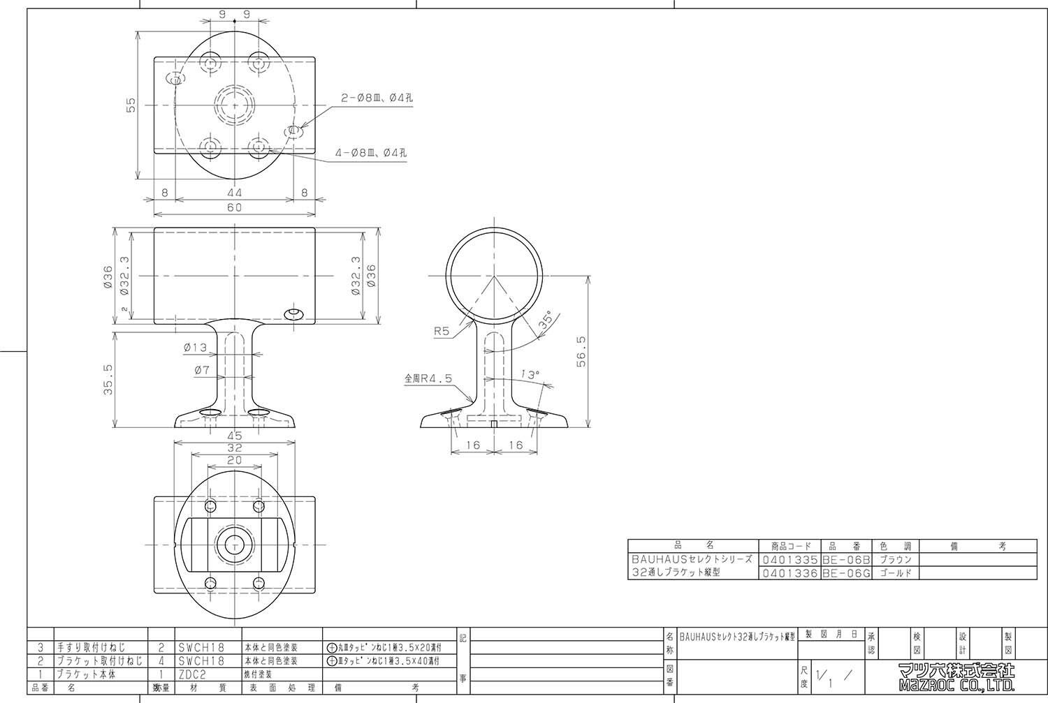 マツ六 手すり部材 BAUHAUS セレクト 32通しブラケット縦型 BE-06B ブラウン