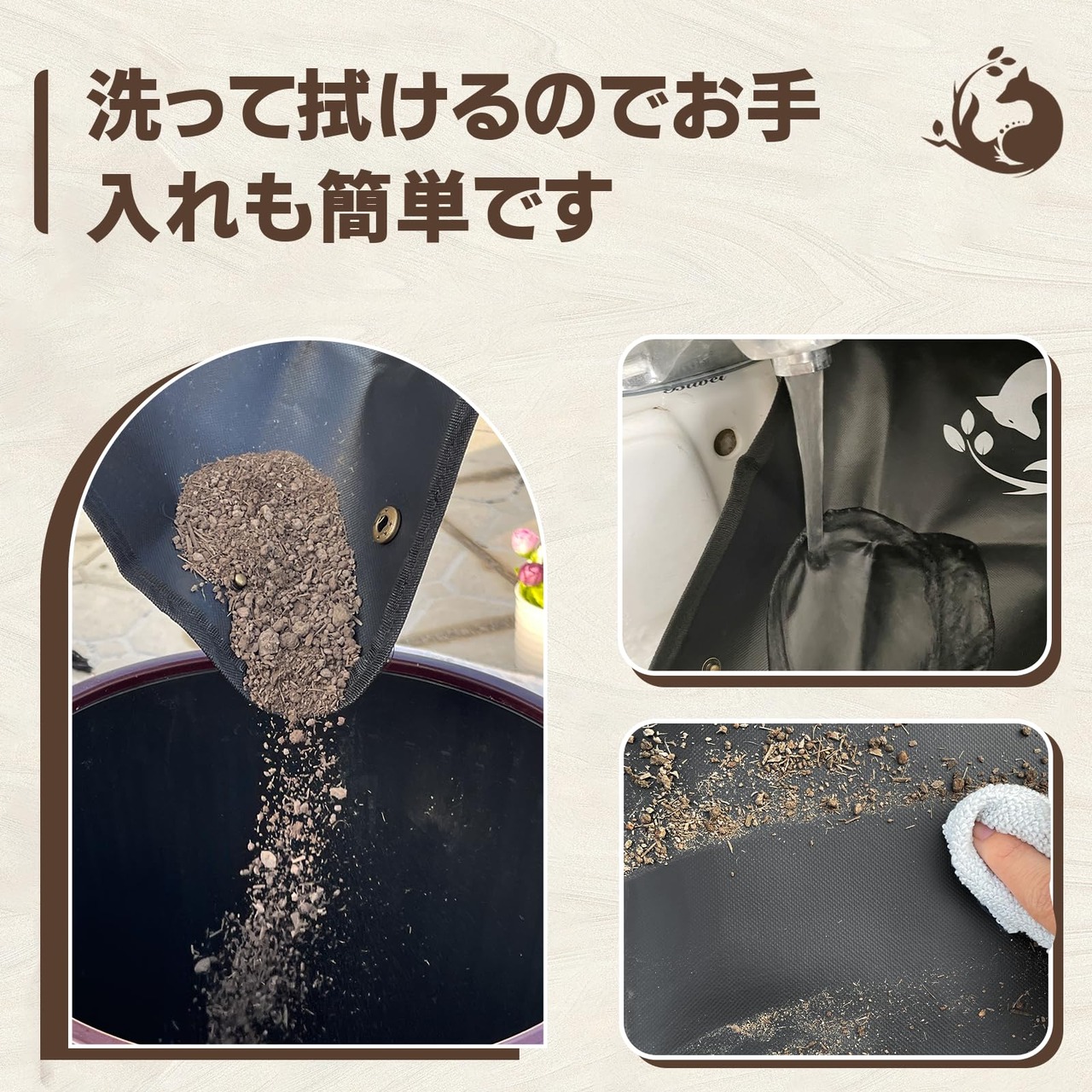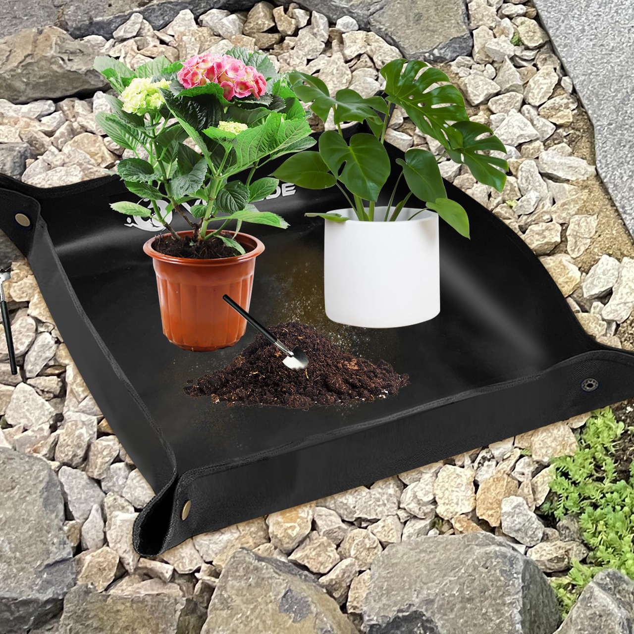 【多用途で使える園芸の必需品】鉢植えのサイズによって使い分けできる大小1つづつのセットです。更に土をほぐすのに使える3点セットと掃除用のタオルもついており、草花の植え替え、分配、混合や剪定の際に地面が汚れず片付け作業が楽になります。