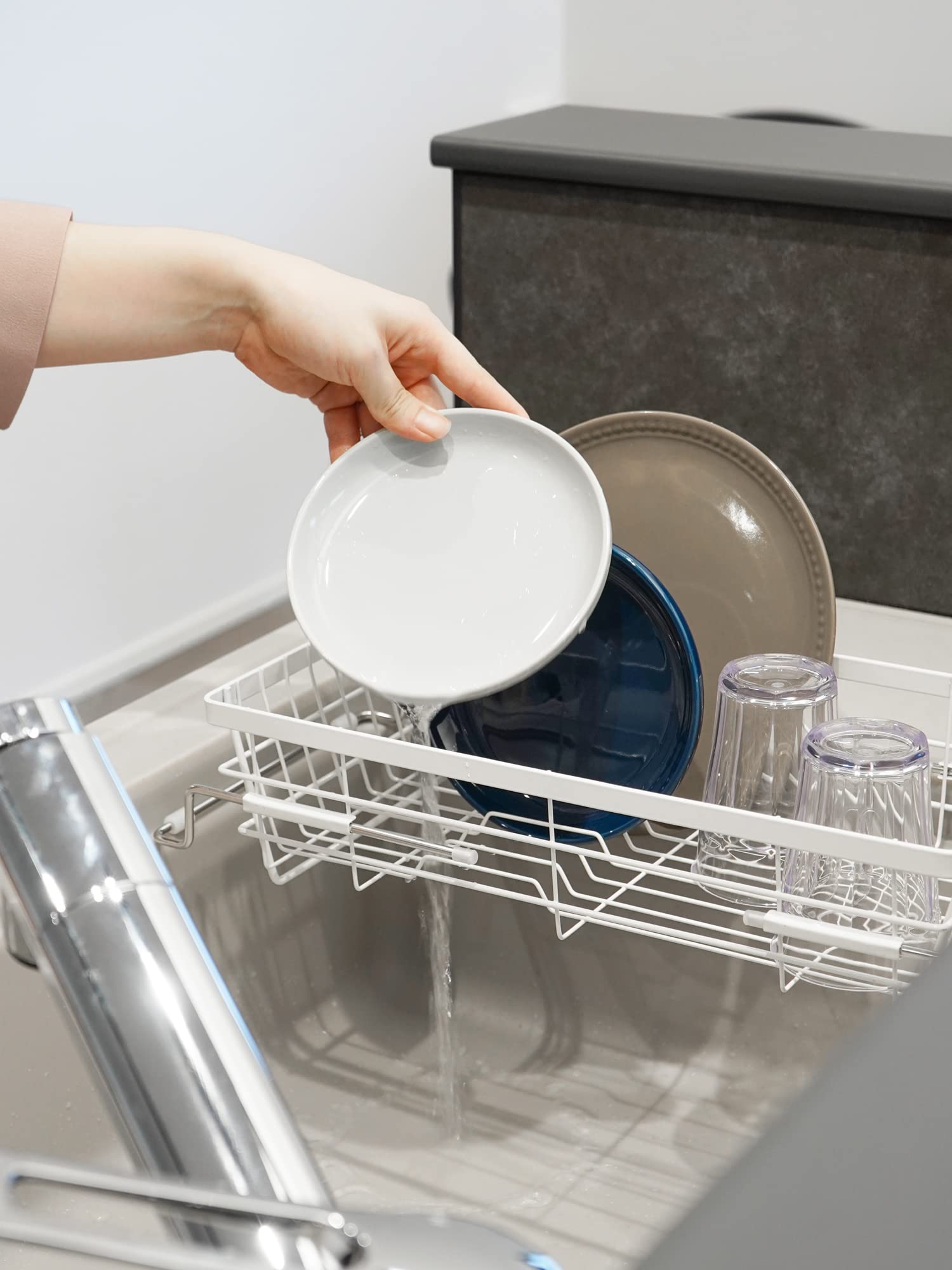 シンク内にかごを設置できるので水滴はそのままシンクへ。スライド式のバーで様々なシンク幅に対応できます。