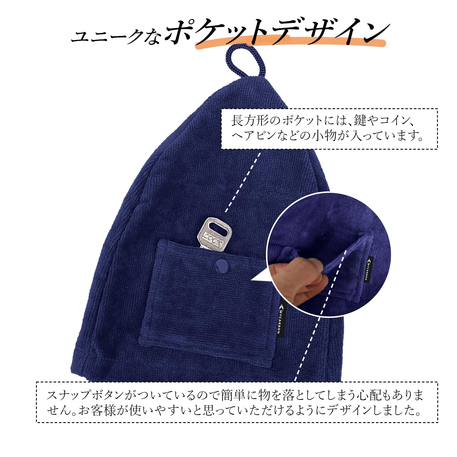 【ユニークなポケットデザイン】ハットの上には長方形のポケットがあり、鍵やコインヘアピンなどの小物が入ることができます。スナップボタンが付いているので、小物を落としてしまう心配がありません。