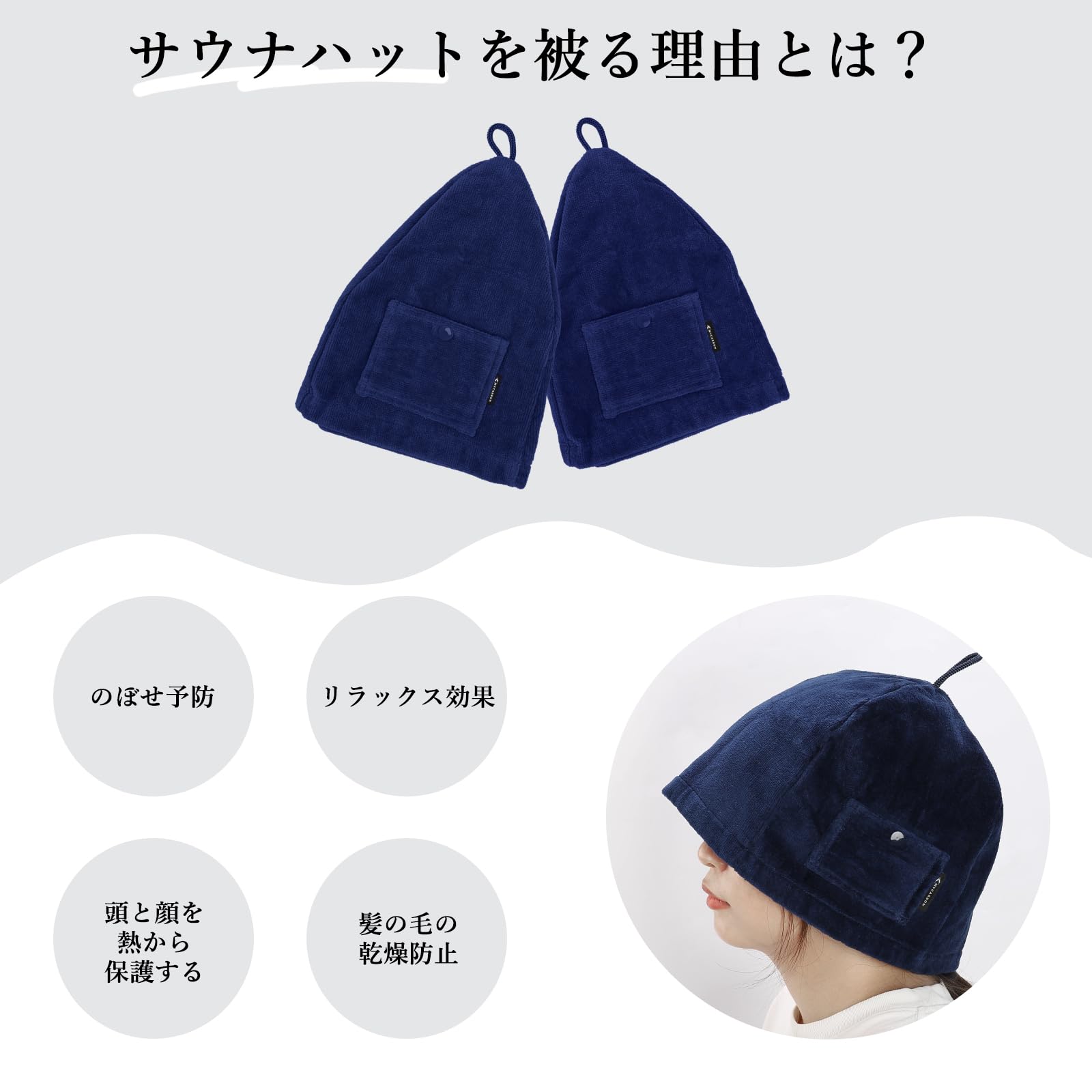 【髪と頭皮を守る】濡れた髪は熱で傷みやすく、かゆみの原因のひとつになります。サウナハットをかぶることで、熱ダメージから髪と頭皮を守ることができます。サウナの翌日も頭が痒くなる心配はありません。