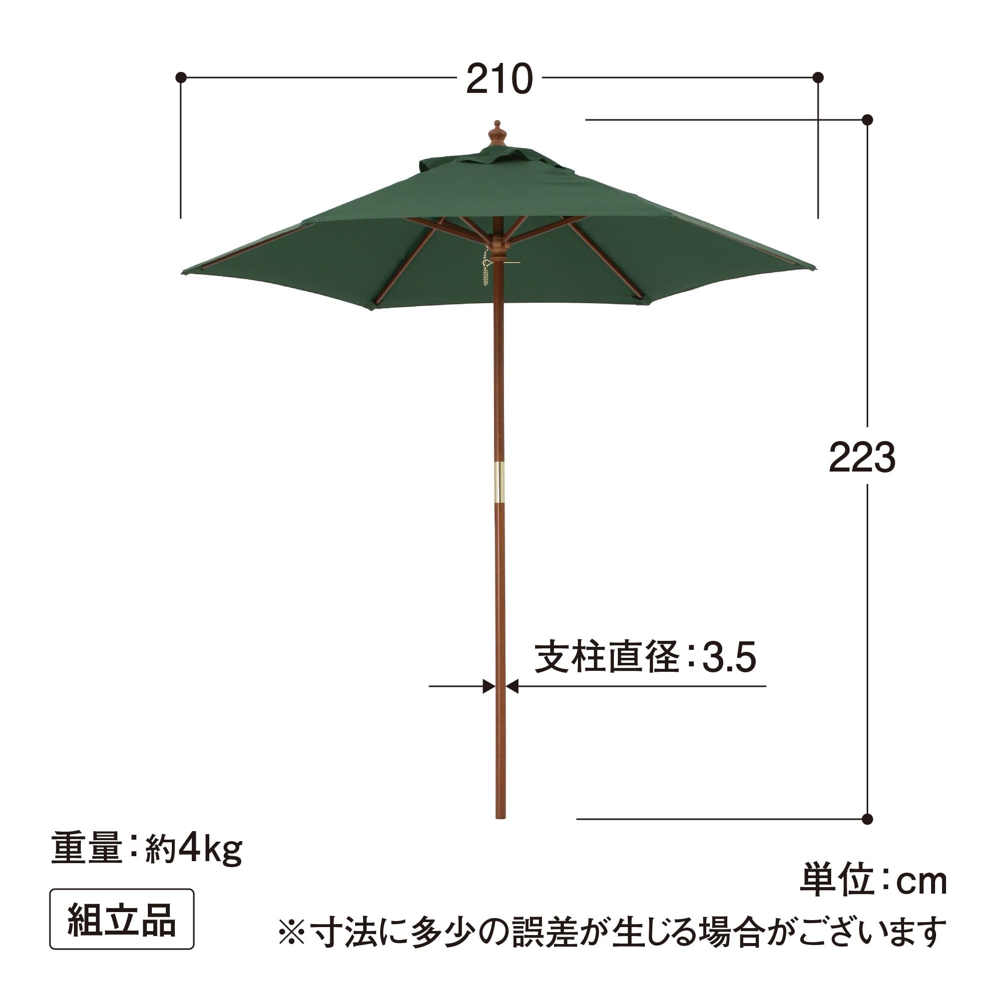 サイズ:約直径210cm×高さ223cm、重量:約4kg、支柱:約直径3.5cm、親骨:約105.4cm