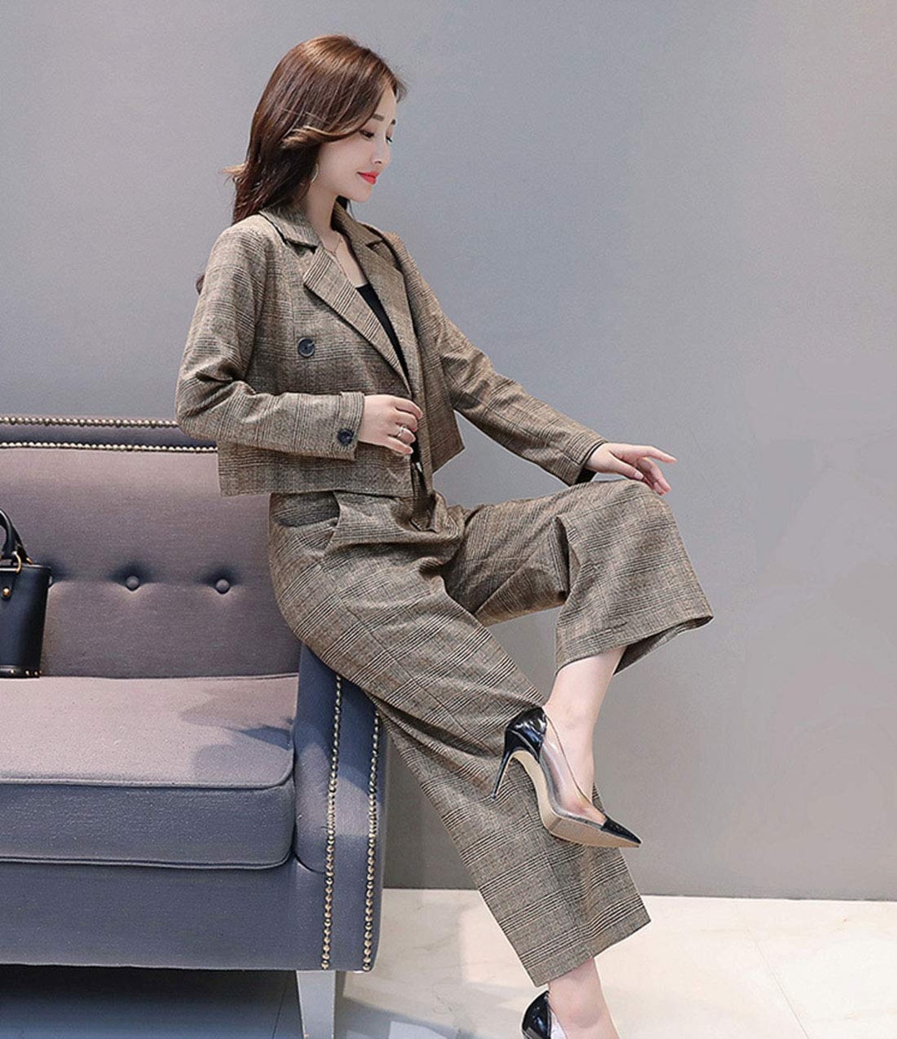 [Sueeya] (スイーヤ) スーツ レディース パンツスーツ 上下セット グレンチェック 着痩せ テーラード ファッション ワイドパンツ 九分 おしゃれ 2点セット 春 秋 冬 通勤 フォーマル OL | geisha Cat*