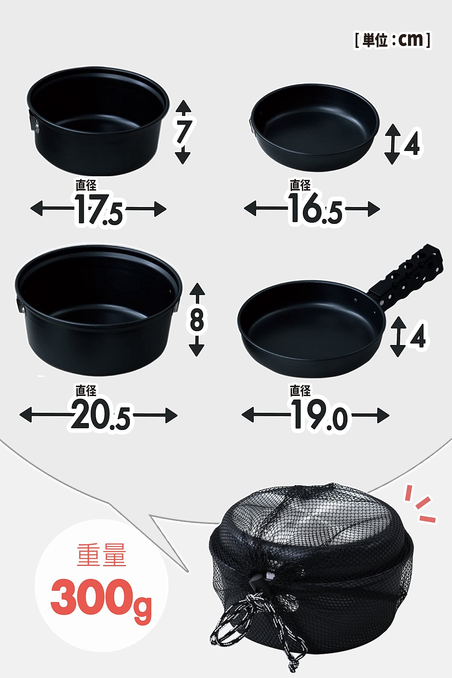 [キャンパーズコレクション 山善] アルミ製 クッカーセット 5点 ソロ キャンプ アウトドア 防災 セラミック塗装 着脱式の取っ手 軽量 コンパクト 収納袋付き ブラック アウトドアクッカーセット OCS-4