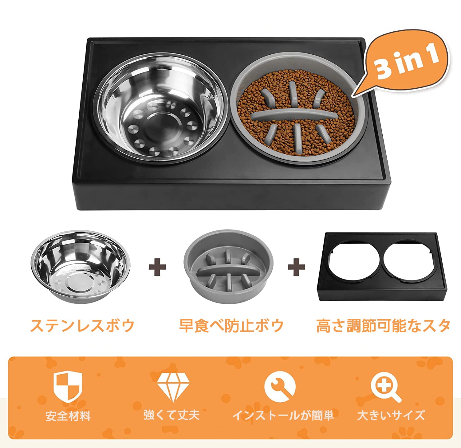 【犬 食器 商品仕様】犬食器台、長*幅45cm*8.5cm、重量1.2kg、600mlステンレス餌皿*1個,早食べ防止ボウル*1,フードとウォーターボウルとして使用できるペットボウルです。