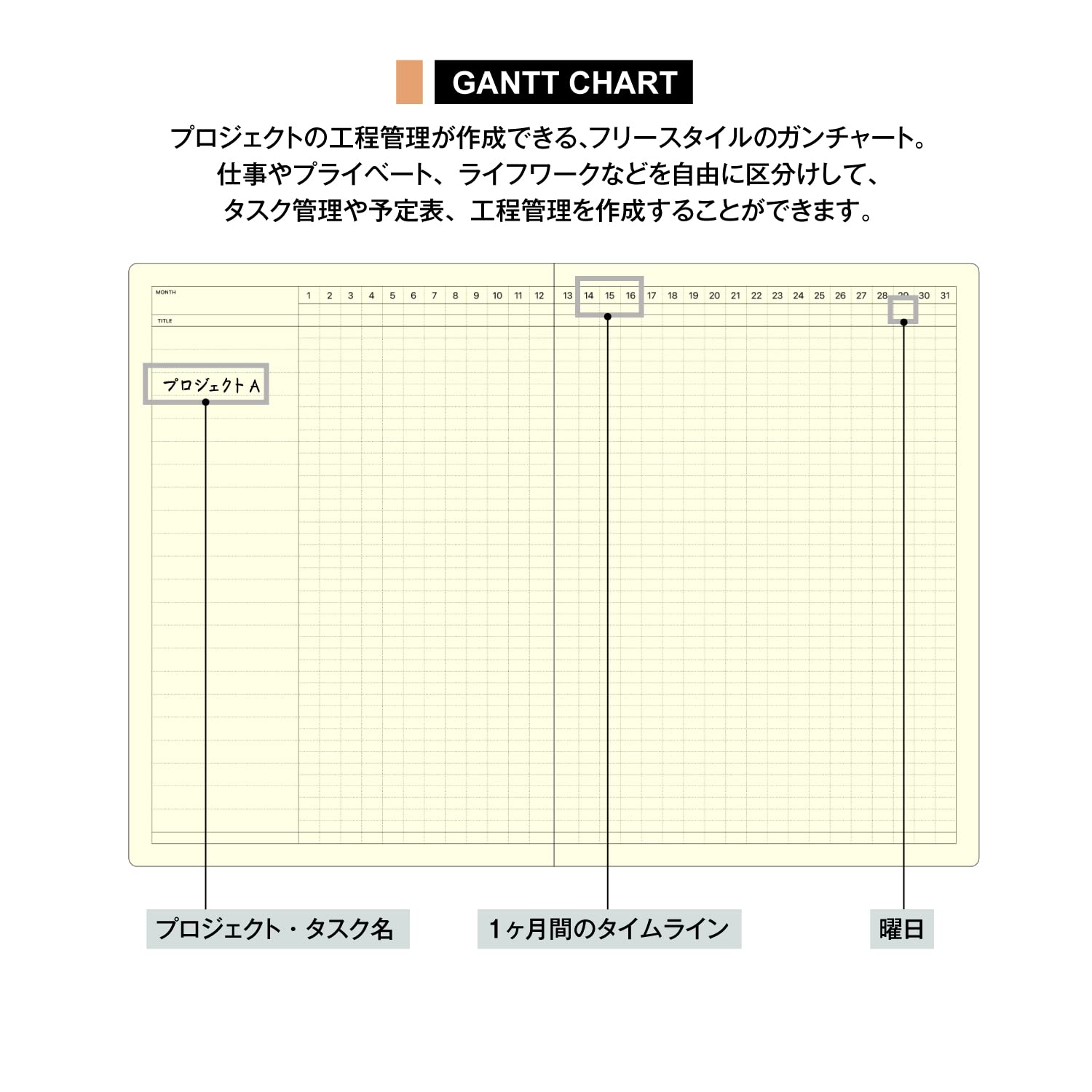 【内容】ガントチャートマンスリー(見開き1ヶ月)24ヵ月分、グリッドメモ12ページ