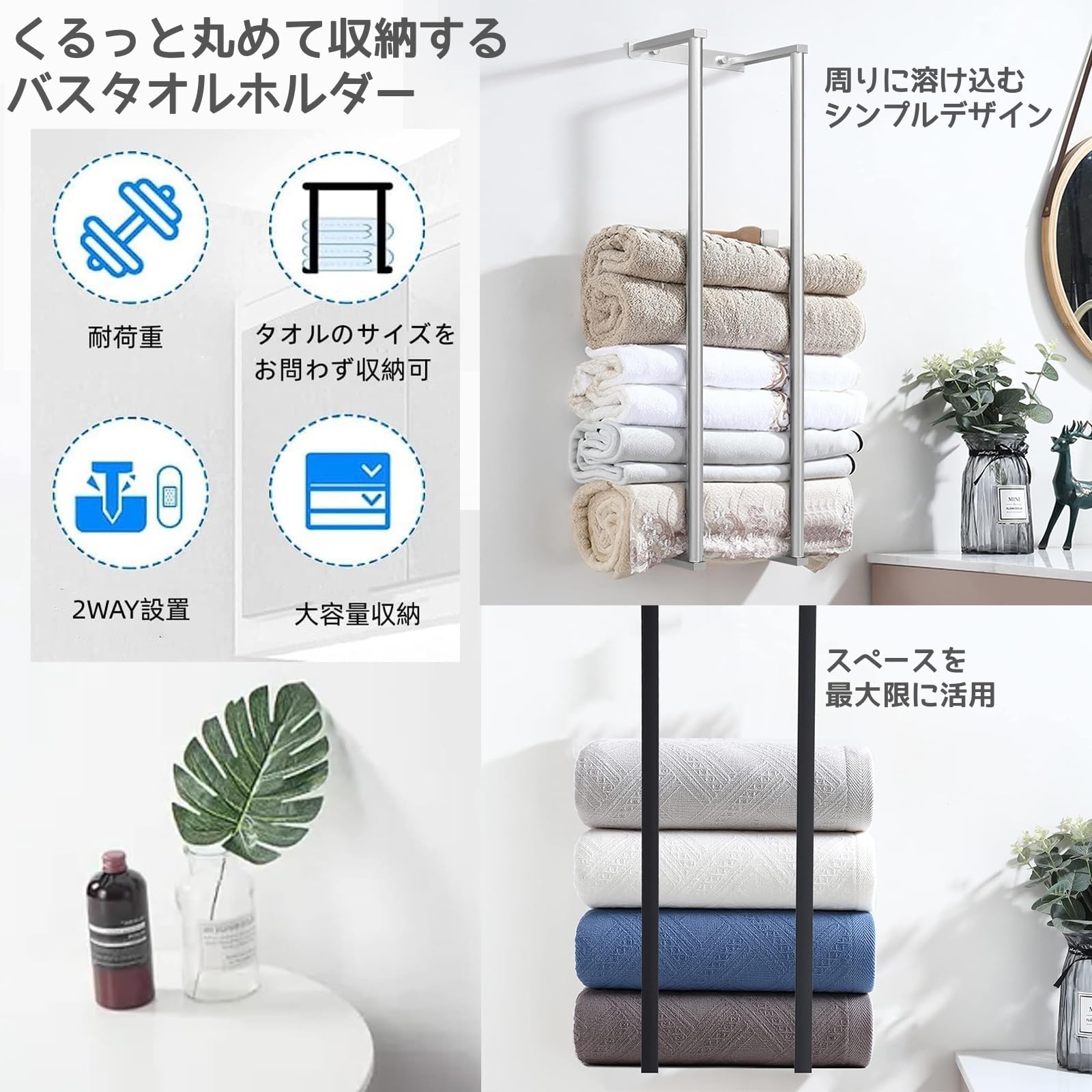 【幅広い用途】このタオル掛け 壁取り付けは省スペースで、バスルームのスペースを取りすぎず、タオル、バスタオル、ヨガタオルなどを収納できます。バスルーム、ホテル、サロン、ランドリールームなどの場所に適しています。