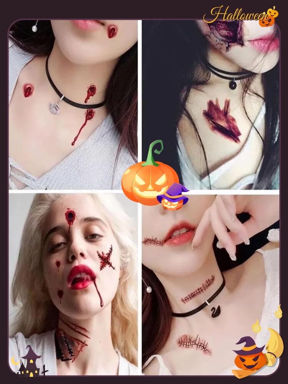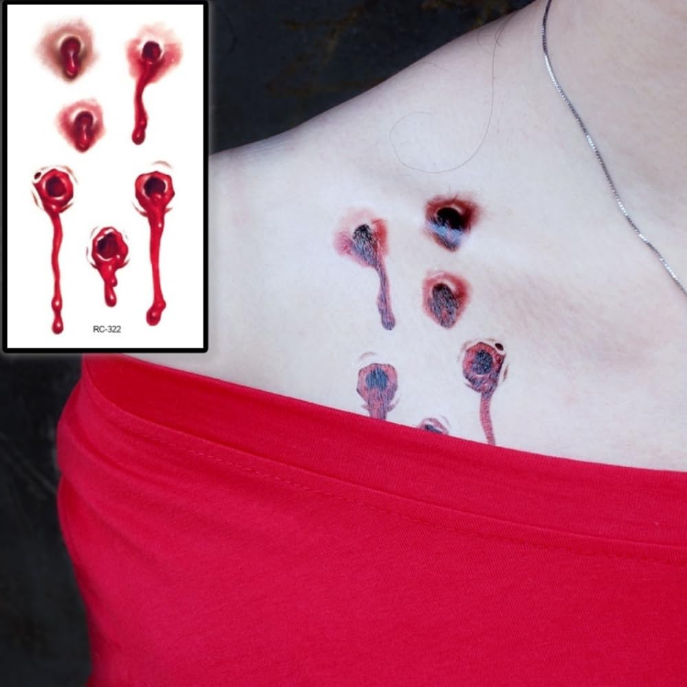 【ハロウィンタトゥーシール】特殊メイク効果のある痛々しいタトゥーシールです。非常にリアルな傷跡、男性と女性でも怖がらせる面白いタトゥーシールです。フェイスやボディーなどのアートメイク、ハロウィーンパーティーに最適な小物です。