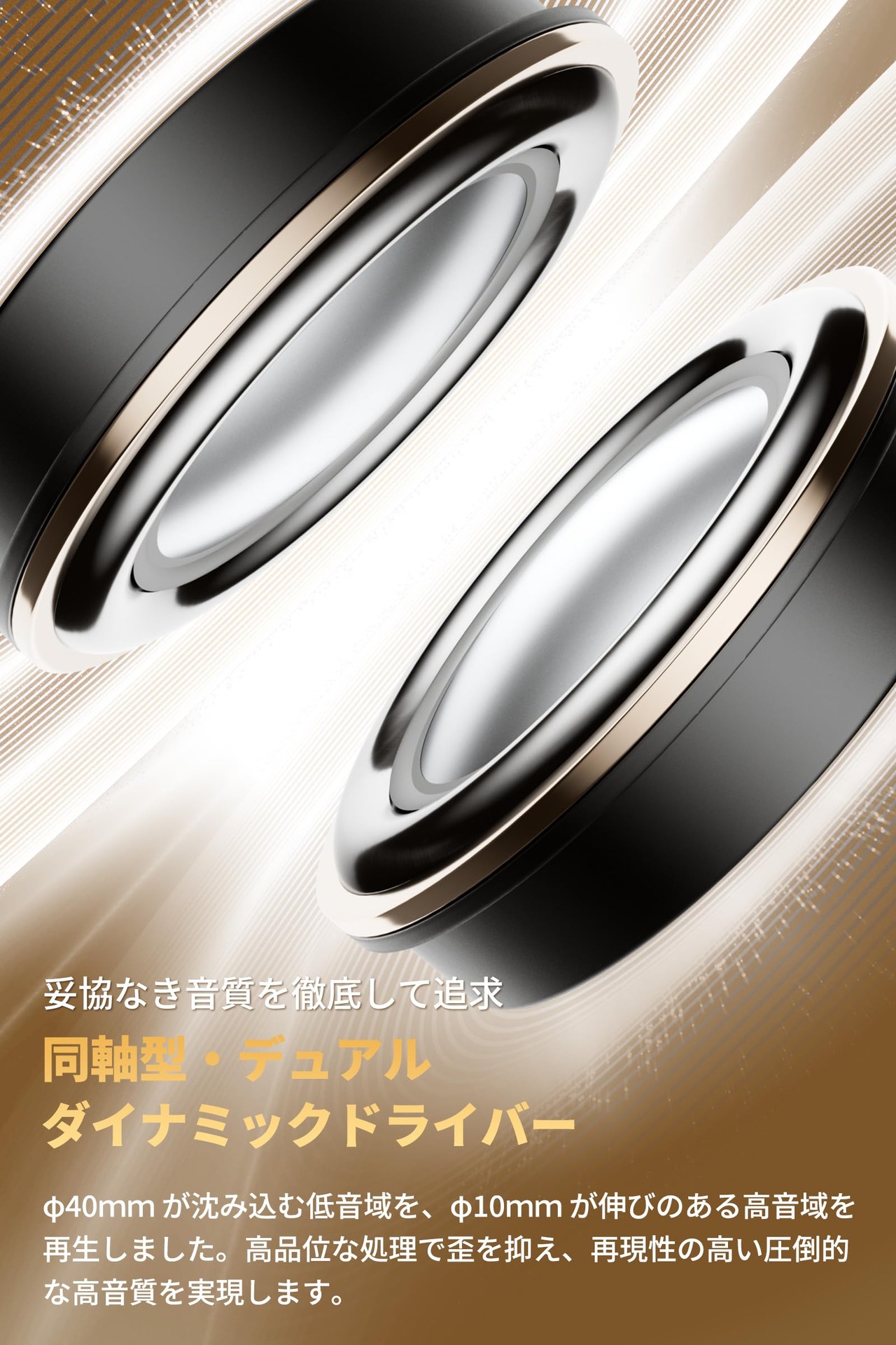 【40mm+10mm 同軸デュアルドライバー! 圧倒的な臨場感と繊細な音の再現力を両立】 SOUNDPEATSは、音質に妥協しません。このSpace Proは、SOUNDPEATSで初めて デュアルダイナミックドライバーを採用。中低音域を担当する40mm径ダイナミックドライバーと、高音域を担当する10mm径ダイナミックドライバーを同軸上に配置しました。振動板の素材も慎重に検討し、耐熱性と強度、内部損失に優れることから、40mm径振動板にはポリエーテルエーテルケトン(PEEK)、10mm径振動板にはポリエチレンテレフタレート(PET)を採用しています。2 基の振動板は互いに干渉せず高い同期性を保ち、音の歪みを抑制するとともに、位相特性に優れた自然な描写を実現しています。