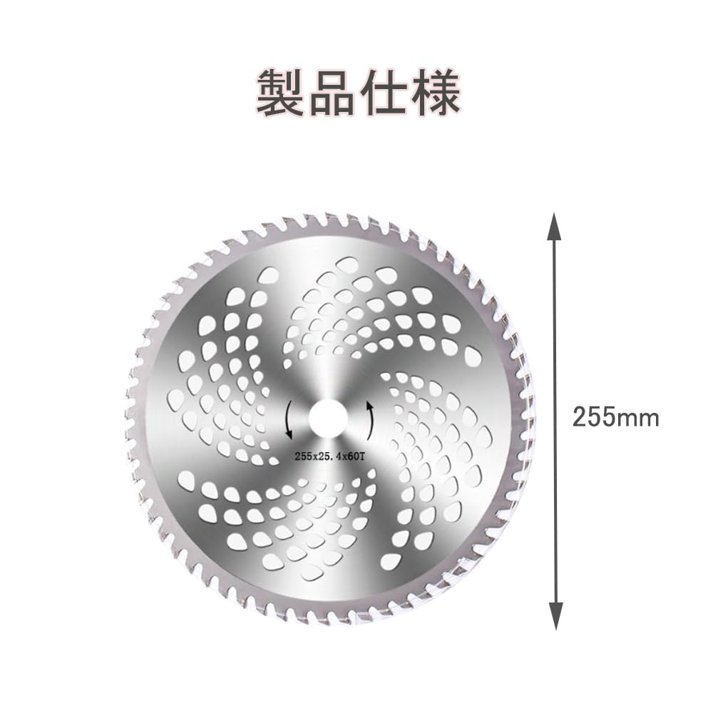 【サイズ】外径約255mm×内径約25.4mm×刃厚約1.5mm、刃数:60P 、重量:約338g/1枚あたり。ご購入前に草刈機のサイズをご確認ください。