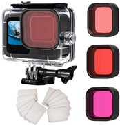 【ダイビングフィルター3セット】Go Pro Hero 12/11/10/9 Black用のFitstill防水ケースに3つのフィルターを簡単に取り付けることができます。ピンク フィルターは、水深 2 ~ 15 フィートのシュノーケリング エリア、青い水、または透明な淡水での色補正に使用されます。赤色フィルターは、水深 15 ~ 85 フィート、青色または熱帯水域での色補正に使用され、スキューバ ダイビングやフリーダイビングに適しています。マゼンタ フィルターは、水深 7 ~ 70 フィートの水の色と、7 フィートを超える緑色の淡水の色を補正するために使用されます。