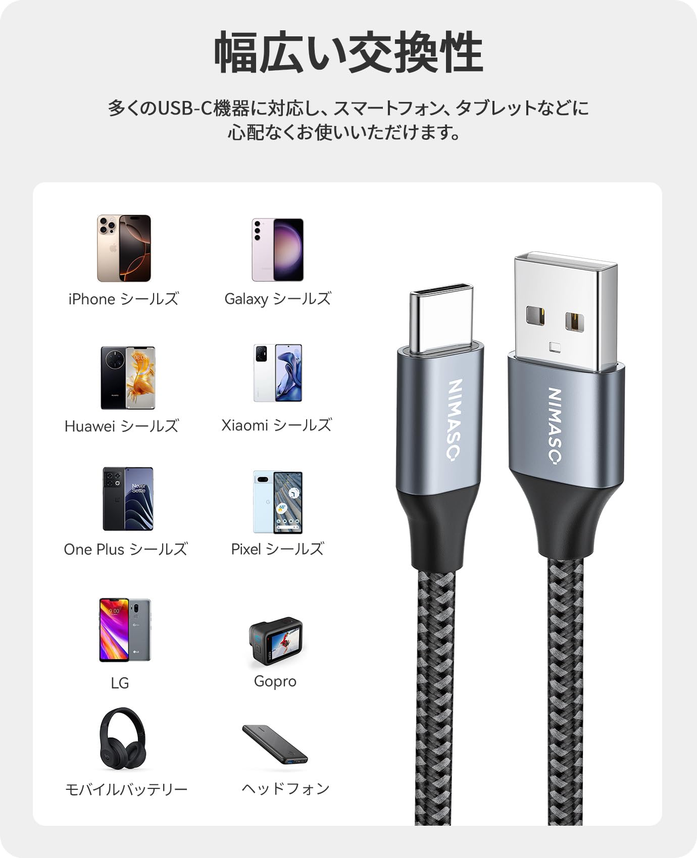 NIMASO USB Type C ケーブル 【2m/2本セット】【QC3.0対応 3A急速充電】タイプc 充電ケーブル iPhone16/15シリーズ、iPad Pro、Sony、Galaxy、Huawei その他Android 等 USB-C 機器対応 NCA21L411