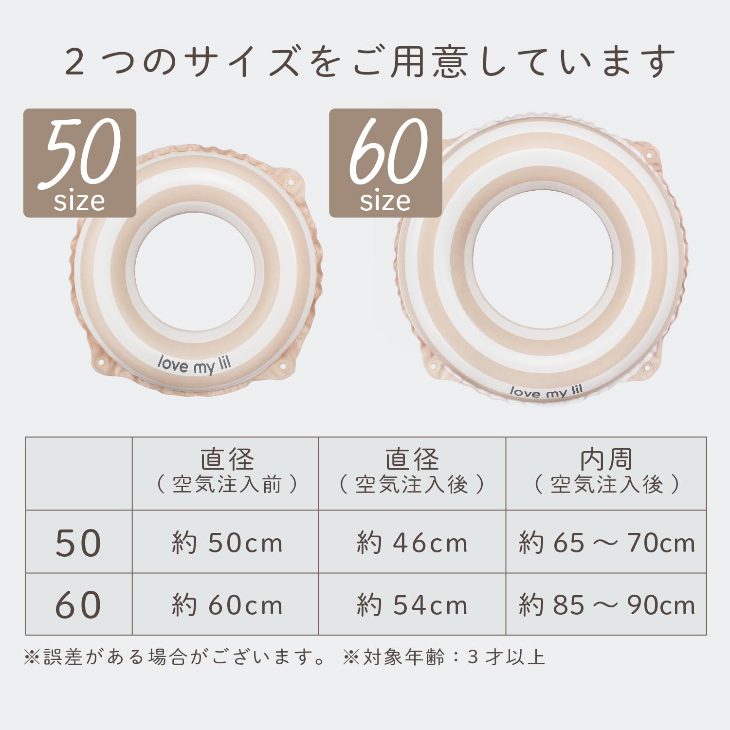 ・50サイズ、60サイズの2サイズからお選びいただけます。どちらも3才以上のお子様が対象です。