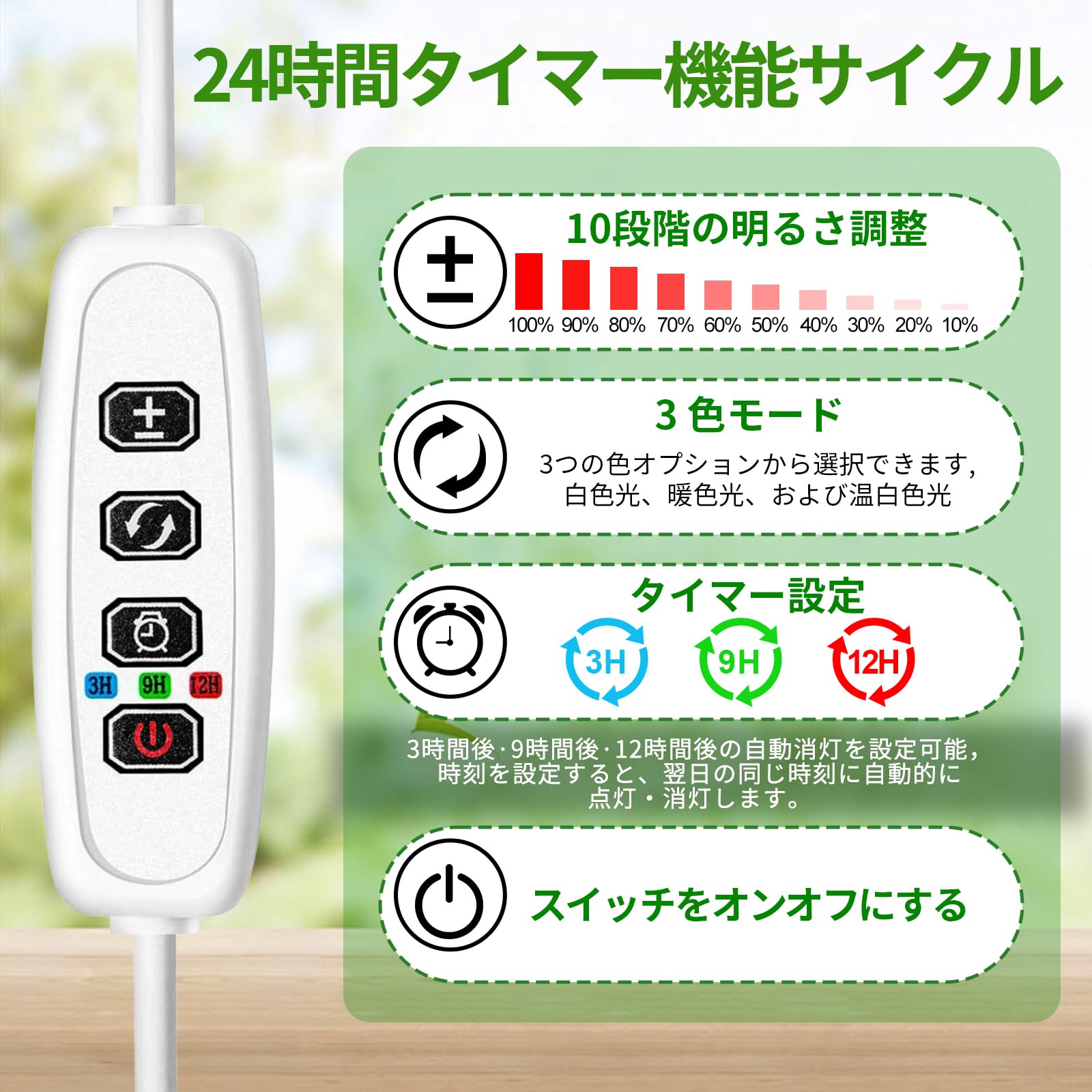 【サイクリック・タイミング機能】植物栽培は3つのループタイマー設定で3/9/12時間、植物による光加減によって異なる時間を設定できます。一度設定でき、毎日自動的にオンとオフになります。 毎日設定する必要はありません。これにより、仕事中や休暇中でも、手作業で植物の世話をする必要がなくなる。注意:充電不可、タイマー機能使用時電源を入れてください。