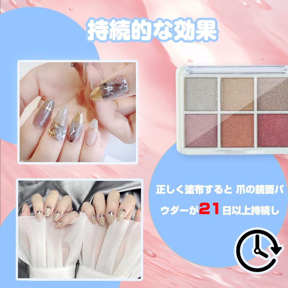 ユーザーフレンドリー性と安全性:本製品はその繊細な微粒子構造で初心者と専門家に愛されており、優れた技術を必要とせずに簡単に手に入れることができる。製品の材質は健康天然成分を選択し、爪に損害を与えない。正しく塗布すると、爪の鏡面パウダーが21日以上長持ちし、美しく色あせない。