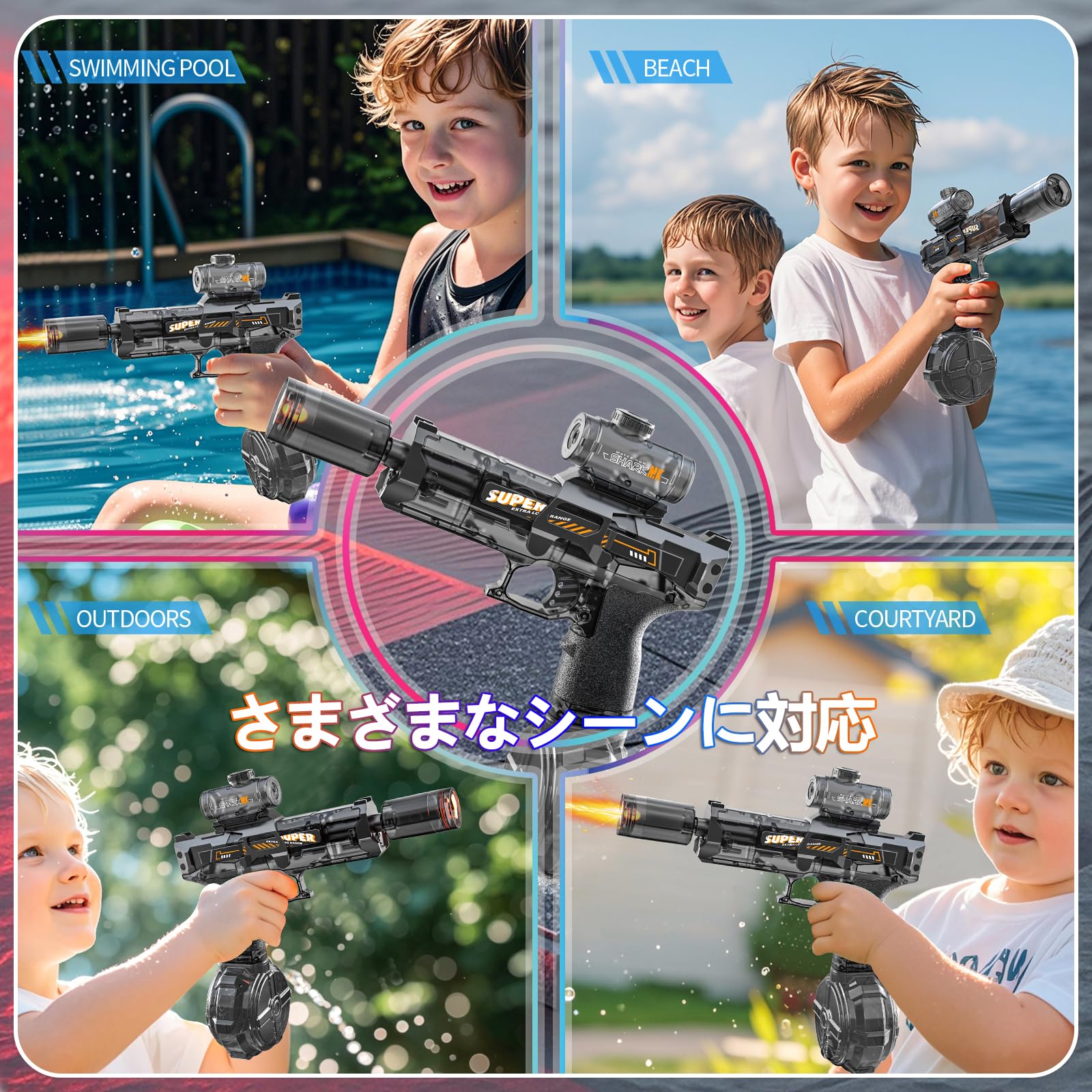 【パワフル電動駆動】パワフルで安定した水流を噴き出すパワフル電動駆動水鉄砲で、ウォーター対戦で勝つ。7-8mの射程距離を実現し、遠くのターゲットにも命中できて、競争優位性を発揮します。