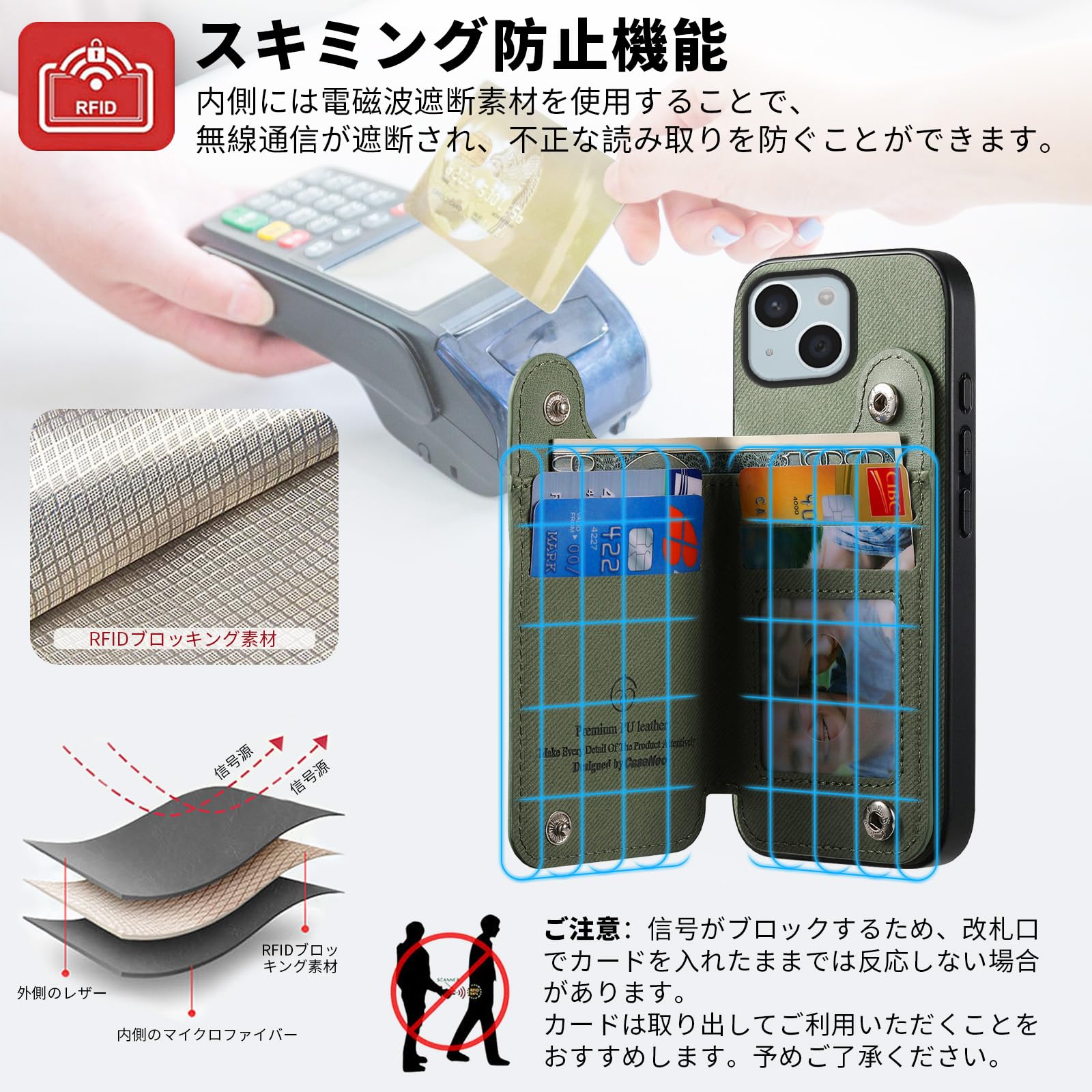3.スキミング防止機能:RFIDブロッキング素材を使用して、ICカードなどの個人情報を保護します。ご注意:この機能により信号がブロックされることがありますので、改札口ではカードをケースから出してご利用いただくことをお勧めします。
