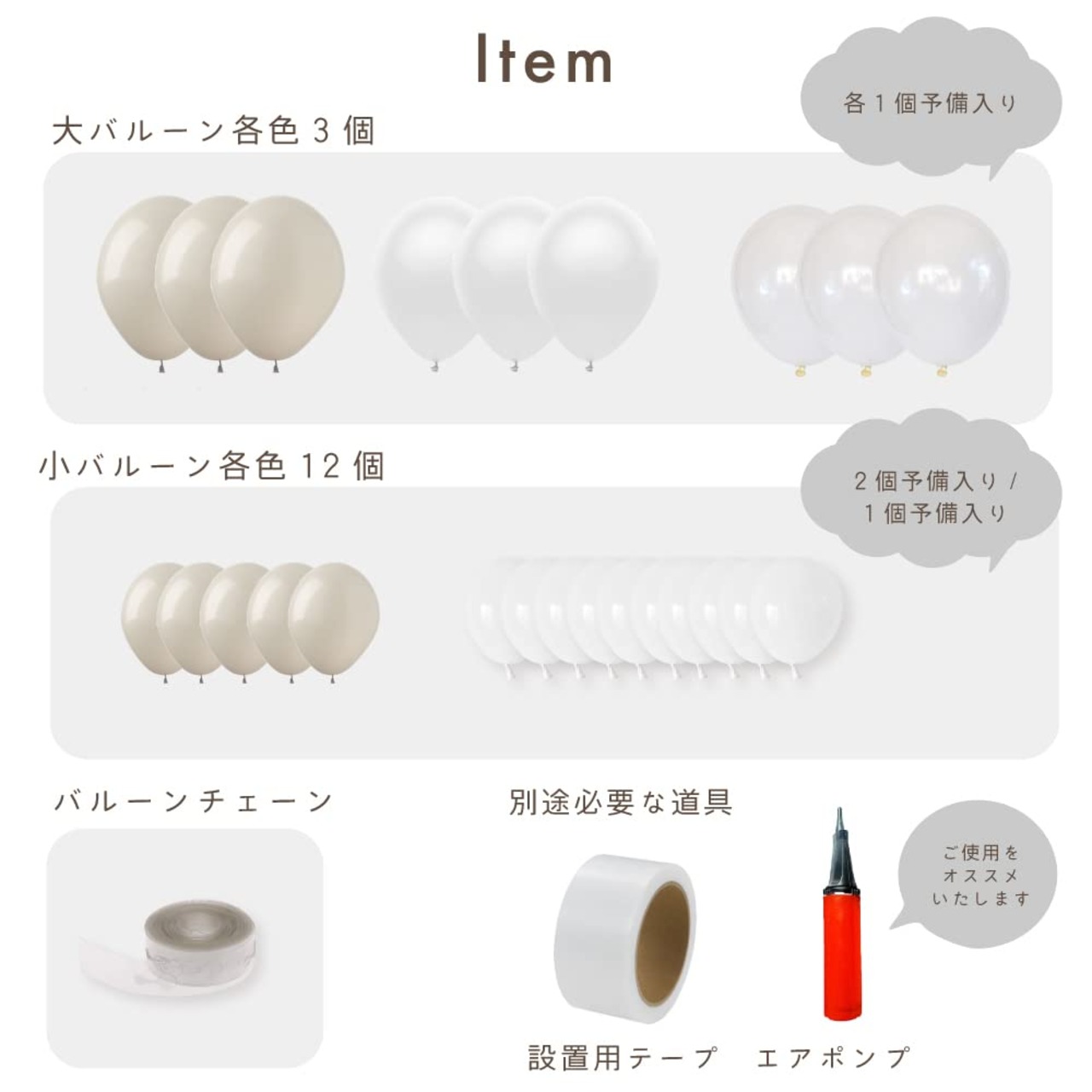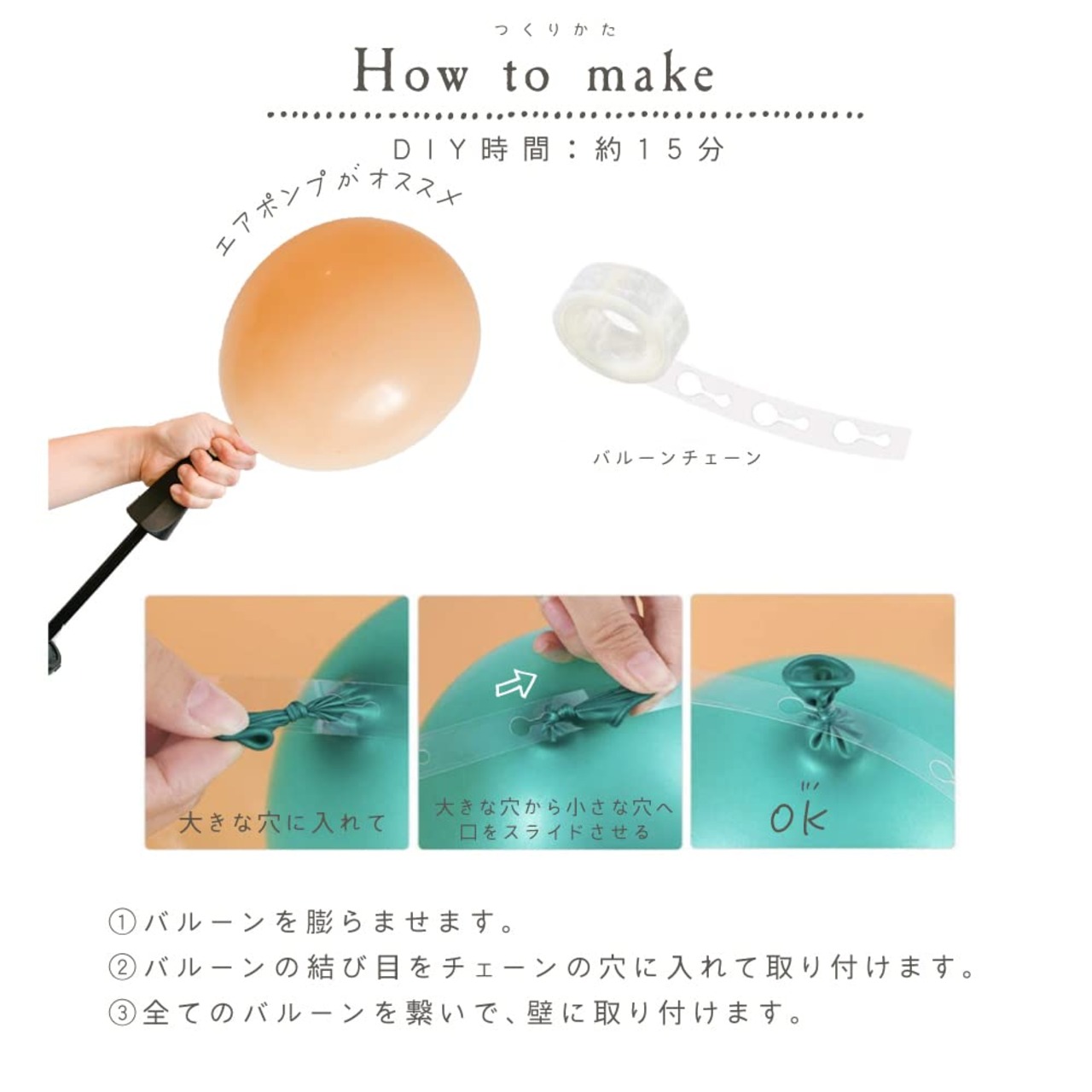 【注意事項】・ゴムバルーンは稀に検品では見つけにくい穴があいている場合がございます。予備バルーン各1個をお入れしておりますので、万一の際はご活用下さい。 ・小さなバルーンは口での膨らし難しい場合がございますのでエアポンプのご使用を推奨しております。・バルーンガーランドは約10日間ほどお楽しみいただけますが、空気を入れて作ってから約3-4日でツヤが無くなってきます。個体差、結びの度合いによってしぼみが早い場合があります。