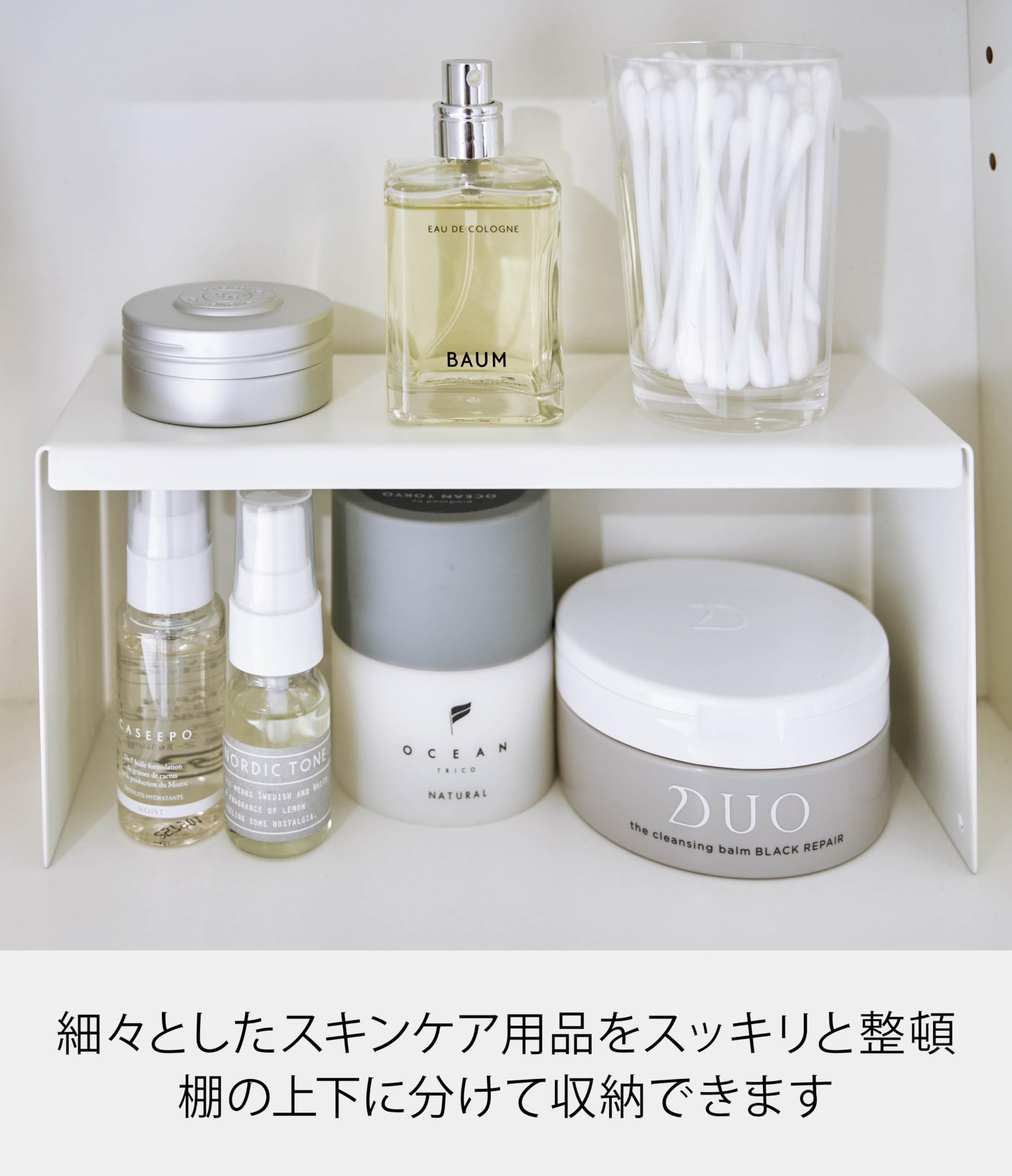 細々としたスキンケア用品を棚の上下に分けて収納できます。