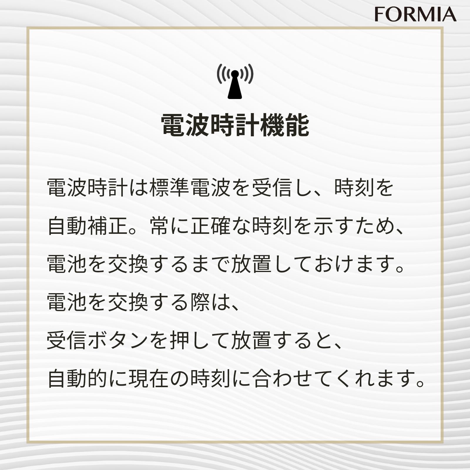 機能:電波受信機能(自動受信、手動受信)、夜間秒針停止機能 (午後10:00~午前6:00)、ステップ秒針