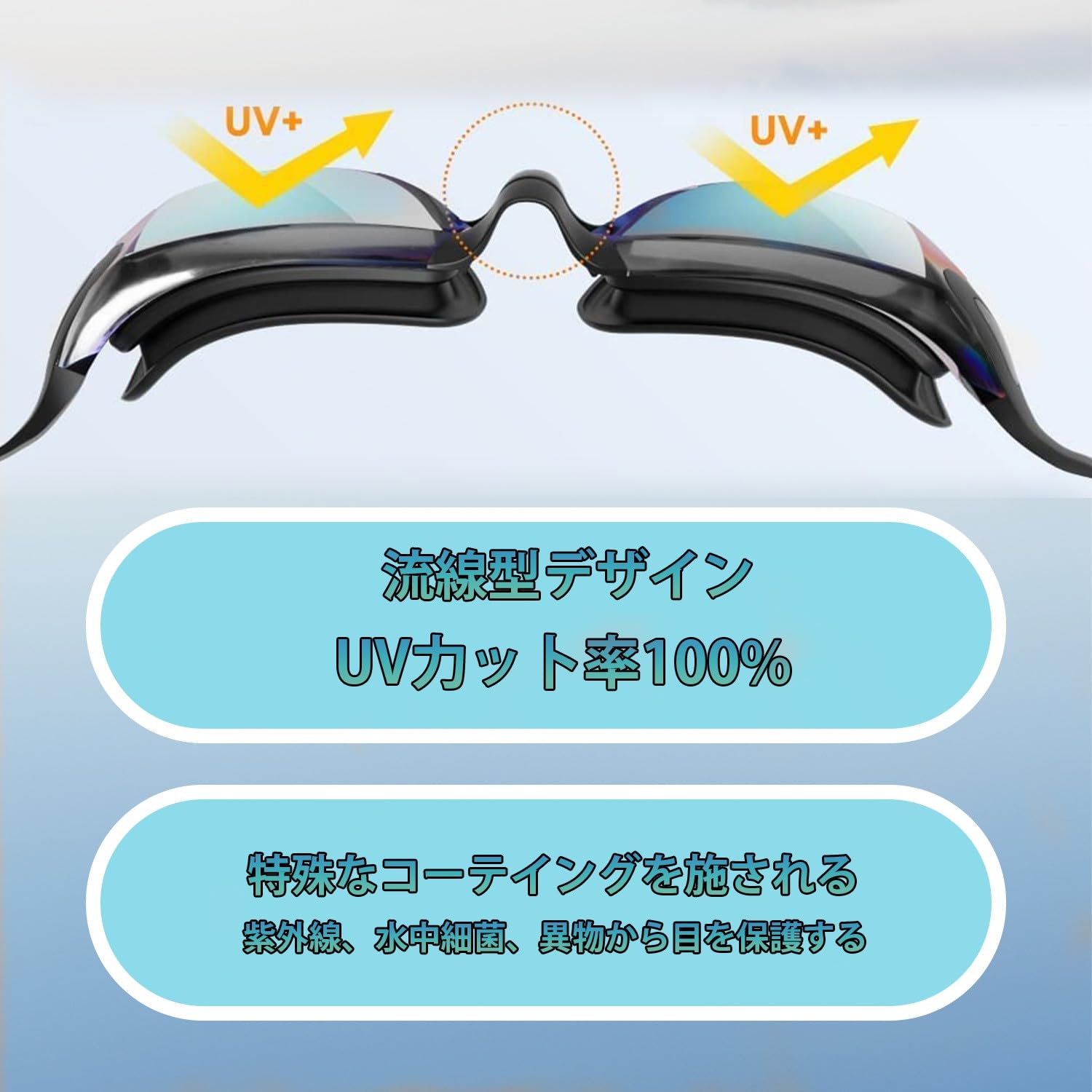 【スイミングゴーグル〡UVカット】紫外線は皮膚だけではなく、眼にも大きなダメージを与えます。このスイミングゴーグルは海や屋外や日当たり強いところでも目がしっかり保護できます。紫外線カット99.9%です!レンズの破損がない限り、紫外線カットの効果が持続しています!レンズ内側にくもり止め加工をすることで、視界の妨げとなる”くもり”を抑えます。くもり止め加工をほどこしていますので、よりクリアな視界が確保でき快適なスイミングが楽しめます。