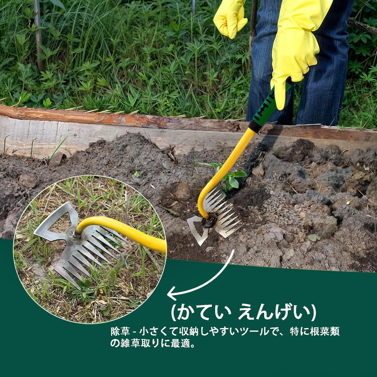 簡単な除草:このツールを使用すると、隅や狭いスペースでも素早く簡単に除草できます。四つの尖った爪は草の根近くの土に刺さり、抜くことができます。これにより土壌表面が改善され、保水性が向上します。
