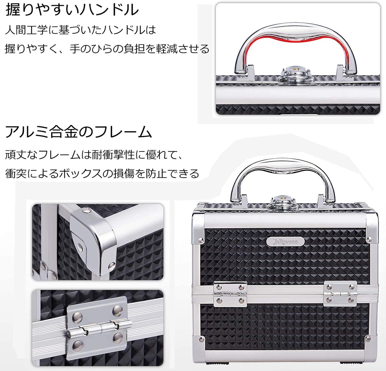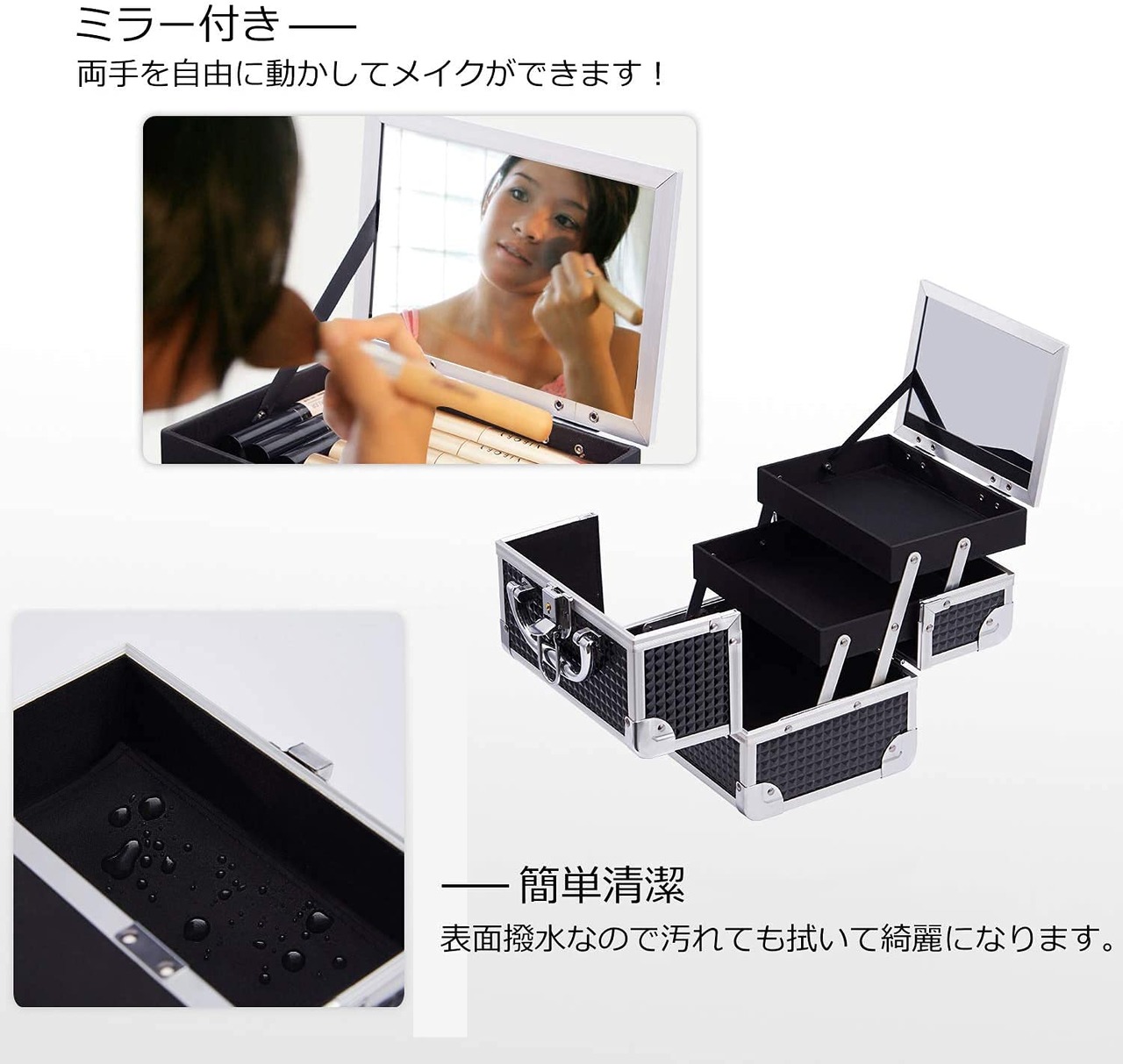 【大容量】伸縮できる収納トレー、広がるタイプが自由に調整可能です。スペースを最大限に活用し、ジュエリーや、メイクアイテムを一目瞭然に収納できるコスメボックス。鏡面内蔵しており、どこでもいつでも簡単にメイクをしちゃいます。
