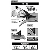 [特徴] ●倍力機構搭載、バネ付ハンドルで少ない力で楽に切れます。 ●ステンレス0.7mm厚対応。しっかり切れます。 ●オフセットした刃により、切った材料が手に当たらず安全に切断作業を行えます。下刃の根元側のくぼみが切断した材料を下方向に逃がし、手と材料が干渉しません。 ●直線切りも曲線切り(反時計回り専用)も可能です。 [用途] ●ブリキ、トタン、ガルバリウム鋼板、ステンレス、アルミ板など金属板の切断に。 [切断能力] ●ステンレス0.7mm、鉄板1.2mm、銅板1.5mm [材質] ●刃部:クロムモリブデン鋼(SCM440)、ハンドル部:スチール・ゴム [仕様] ●全長:270mm ●刃部(有効長):43mm ●刃部硬度:HRC60~62 ●重さ:約500g