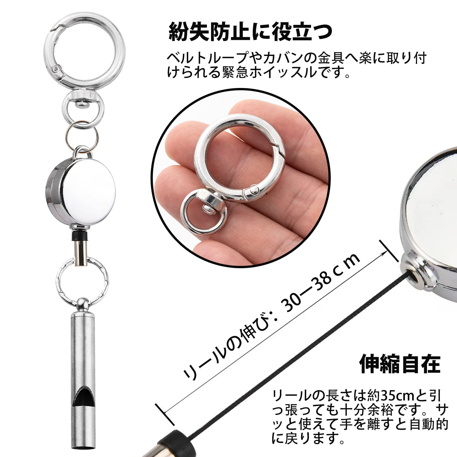2、【心遣い設計】❶携帯性抜群。耐摩耗性ナイロンコードが内蔵されており、摩擦に強く丈夫なリールキー付きホイッスルです。❷伸縮自在。リールの長さは約35cmと引っ張っても十分余裕です。サッと使えて手を離すと自動的に戻ります。❸紛失防止に役立つ。片手で付けられ、外れる心配のないカラビナ付きます。ベルトループやカバンの金具へ楽に取り付けられる緊急ホイッスルです。
