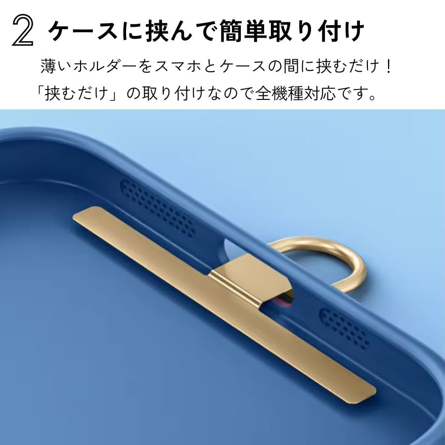 薄いホルダーを端末とケースの間に挟むだけで、別売りのロングストラップやハンドストラップ、カラビナ、キーホルダーなど取り付けが可能になるストラップホルダーです!スマホケースに「挟むだけ」なので全機種対応。機種を選ばずどんなスマートフォンにも対応。機種変後も継続して使えるのも嬉しいポイントです◎耐久性に優れたステンレス素材を採用。
