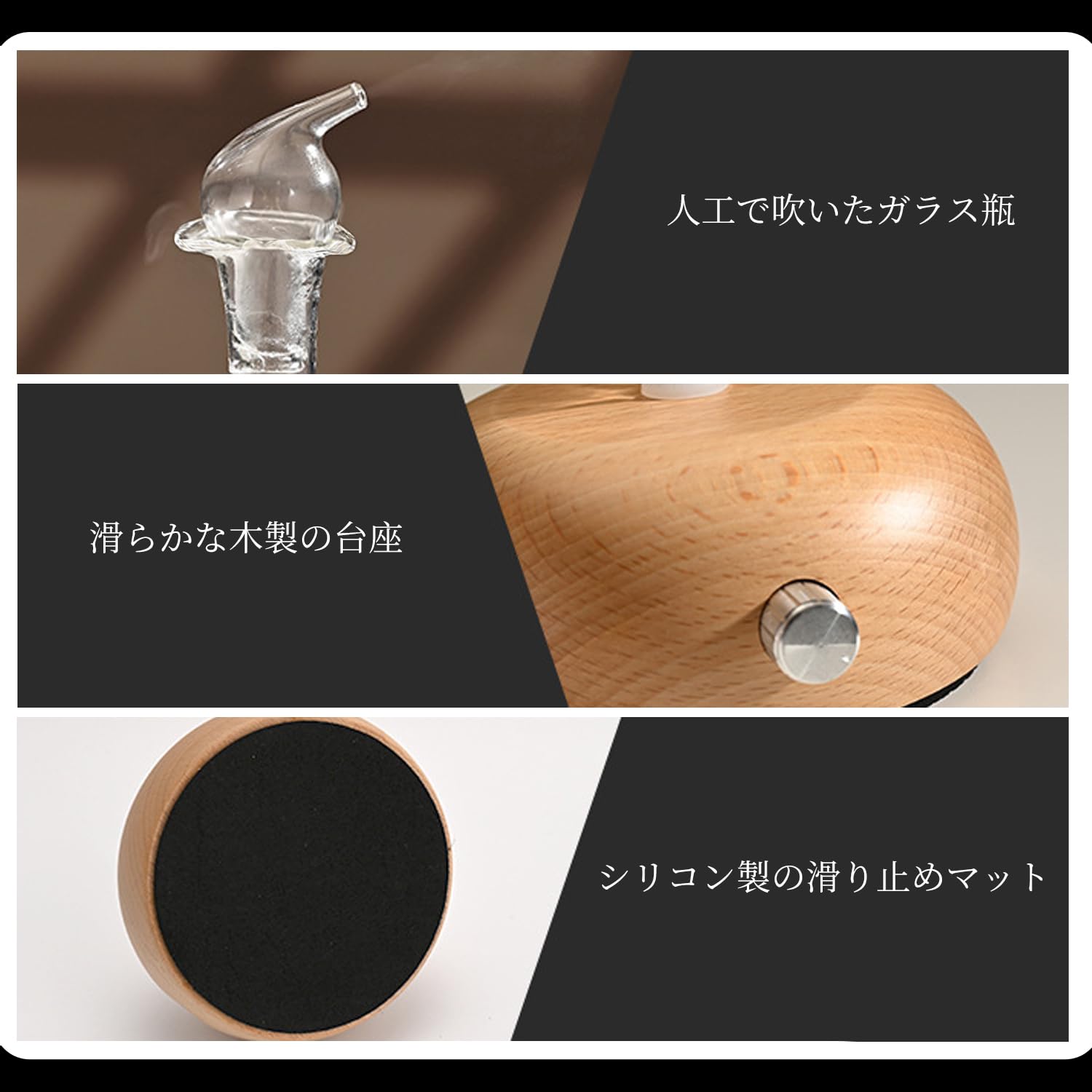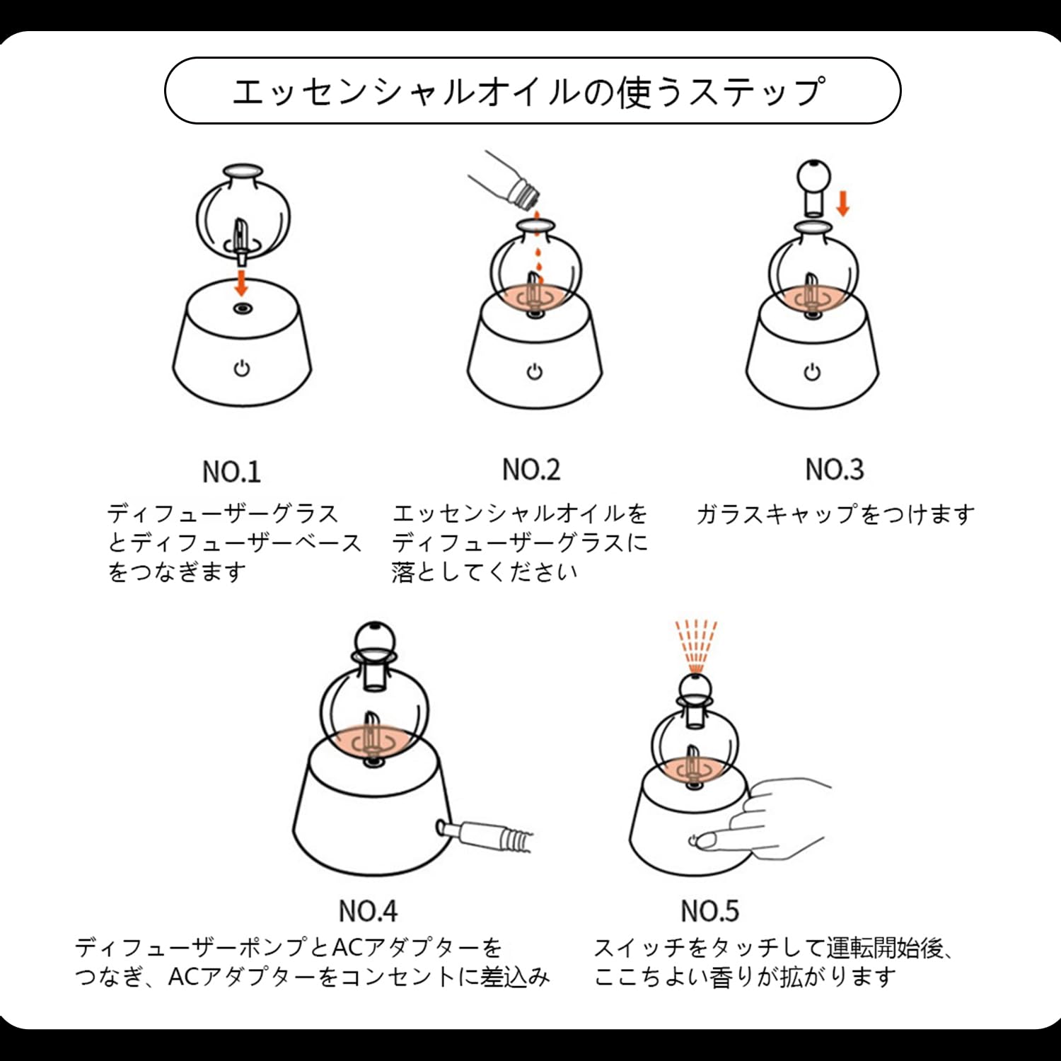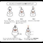 【エッセンシャルオイルの使うステップ】①ディフューザーグラスとディフューザーベースをつなぎます。 ②エッセンシャルオイルをディフューザーグラスに落としてください(通常、15〜30滴が適切、*エッセンシャルオイルはディフューザーグラスの内部ガラス管の先端より上まで入れないで下さい。) ③ガラスキャップをつけます。 ④ディフューザーポンプとACアダプターをつなぎ、ACアダプターをコンセントに差込みます。電源がしっかりと差し込まれているかに注意する。 ⑤スイッチを回転して運転開始後、空気中にエッセンシャルオイルの微粒子が拡散され、ここちよい香りが拡がります。*ガラスキャップをつけたりはずしたりする事によっても香りの強さを調節することができます。