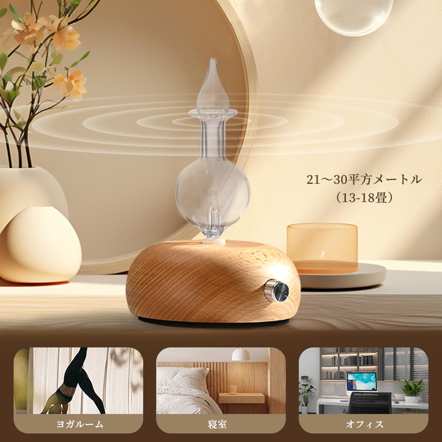【ディフューザー適用面積】21~30平方メートル(13-18畳)、活性マイナスイオンのため、拡散面積が大きい。オフィス、ベッドルーム、リビングルームの場合に使う可能。