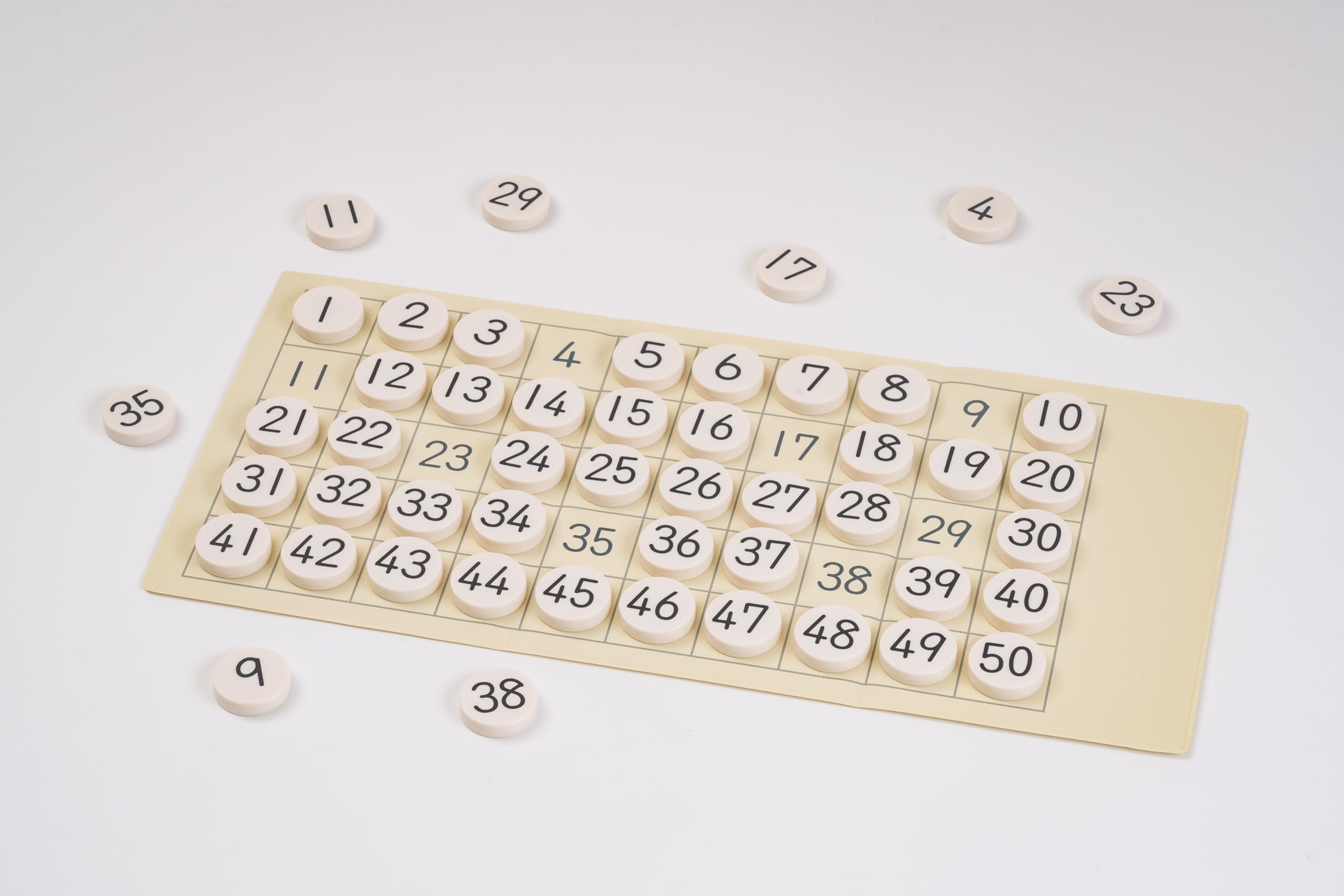 ひらがなの清音を覚える教具です。磁石で遊びながら、ひらがなも数字も学習することができます。駒の表はひらがな、裏は数字が入っています。盤も表はひらがな、裏は1から50までの数字になっています。表面では、ひらがなの形や五十音の並びを身につける「あいうえお盤」として、裏面では「すうじ盤50」として使用可能で、ひらがなも数字も覚えることができます。駒用の収納袋つきです。