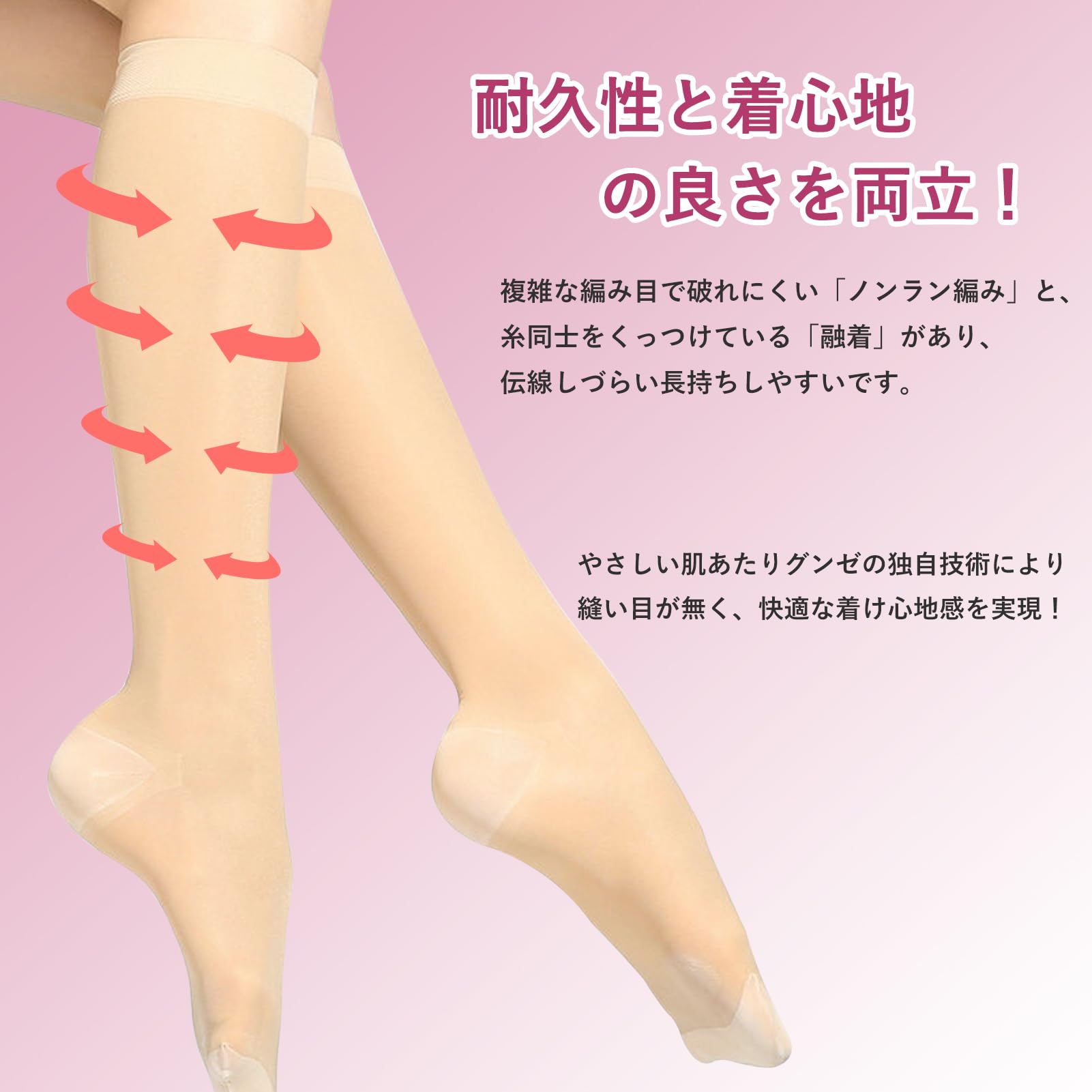 【耐久性と着心地の良さを両立】複雑な編み目で破れが広がりにくい「ノンラン編み」と、糸同士をくっつけている「融着」があり、一般的な加圧ソックスよりも伝線しづらい長持ちしやすいです。丈夫な素材で、つま先部分へ快適性を向上させるデザインを施すと共に、足底部に施されたリブ加工によりフィット感と耐久性が向上します。 縫い目が無いから、やさしい肌あたりMACITEETの独自技術により、チクチクやかゆみといった肌のストレスが軽減され、快適な着け心地感を実現!