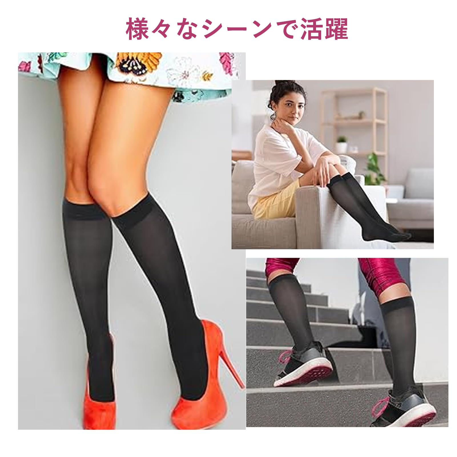 【段階圧力設計・昼夜兼用】普通のストッキングとは違い、特殊な編み方で、足首は31hPa、ふくらはぎは23hPa、足首からふくらはぎにかけて段階的に着圧値を設計することで、無理なく足へ圧をかけるので、日中はもちろん、就寝時に履くこともできます。脚を締め付けることでスッキリ感があり、脚が細く見える効果が期待できるた弾性ストッキング。締めつける範囲がニーハイタイプにより狭いので、締めつけで気分が悪くなりやすい人でも使える着圧ソックスです。着圧ストッキングにはじめてチャレンジする人にはおすすめのハイソックスタイプです。