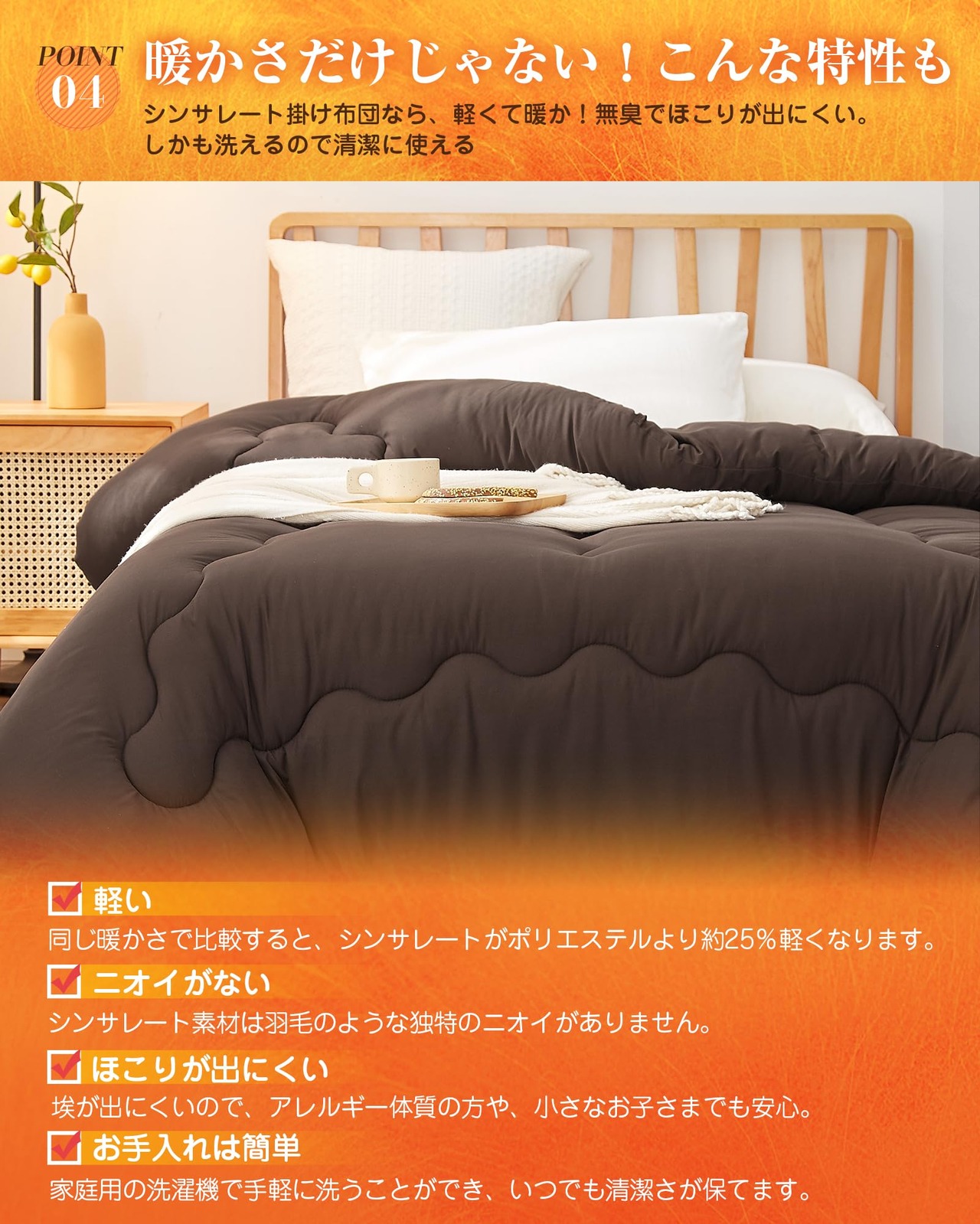 【シンサレート羽毛より暖かい】薄くて軽いのに暖かい!断熱素材シンサレートを全面使用で保温カアップ!同じ厚みの一般的な布団と比べて、2倍の保温機能を持っています。薄くても暖かい断熱素材で身体の熱を外に逃さず、しかも湿気を通すので快適です。