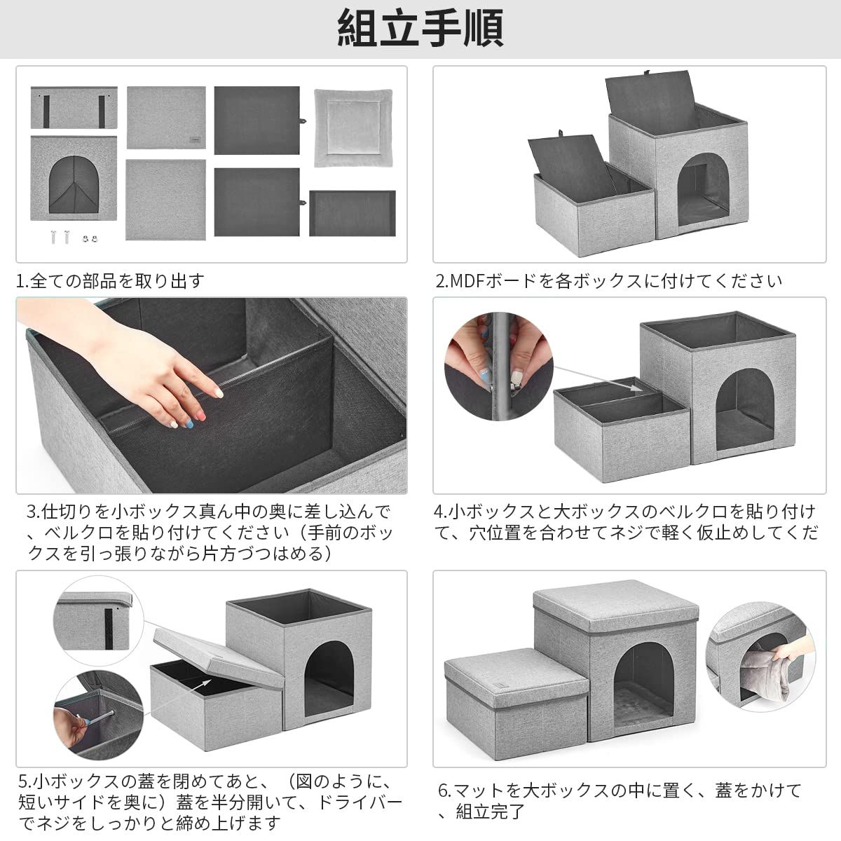 【階段、ベッドと収納を一気に】ステップの中もムダなく活用。階段はもちろん、小さな箱の蓋を開けると収納スペースになっており、大きな箱は愛犬のくつろぎスペースとして活用できます。マットを外して洗濯することができるので、いつでも清潔にご利用いただけます。