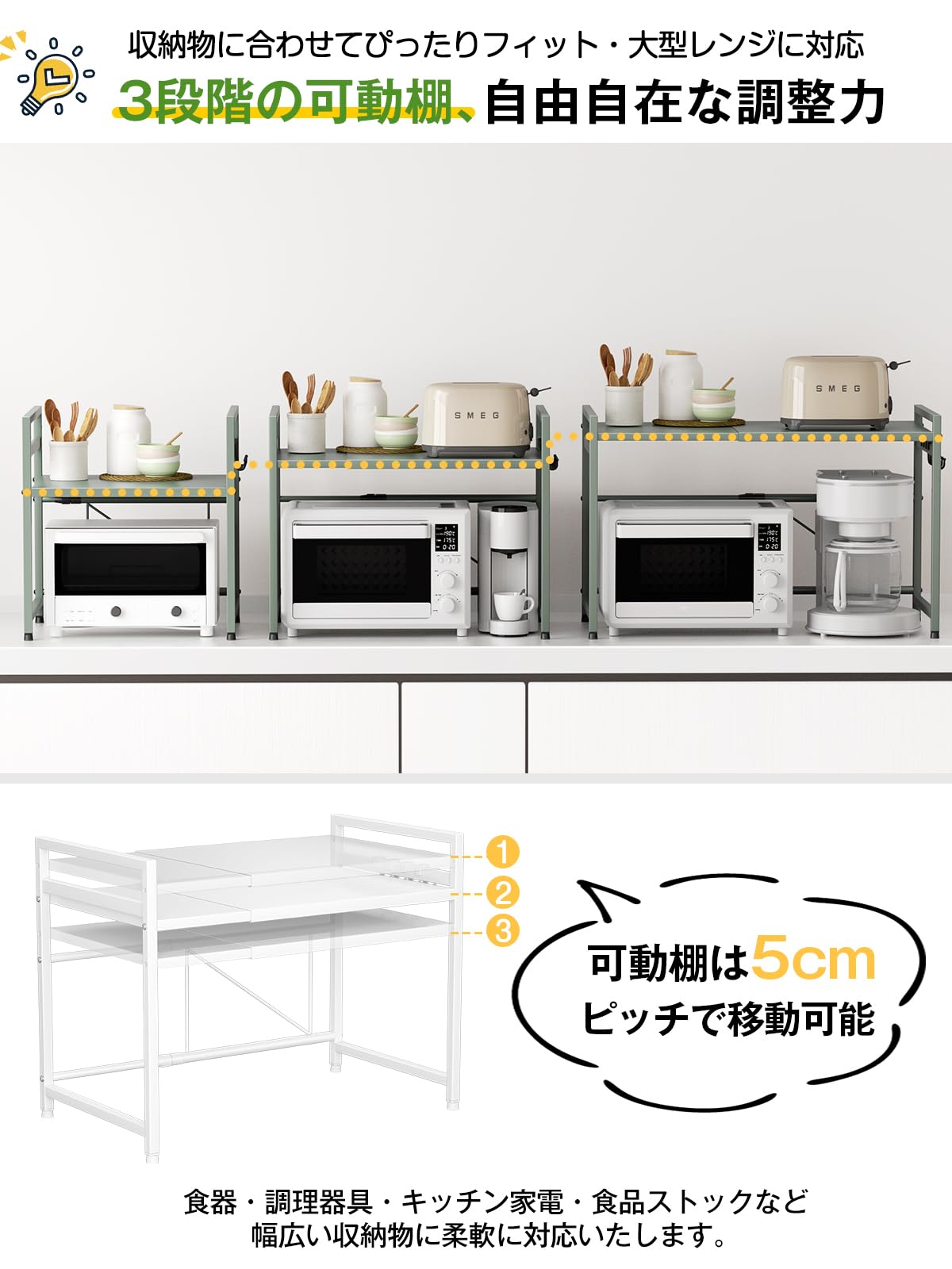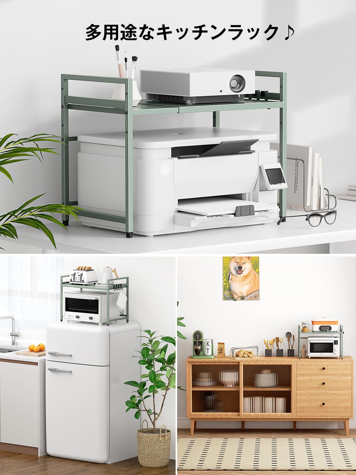 TKUIN レンジ上ラック キッチン 伸縮式 トースターラック 幅(39-65cm) 伸縮可 オーブンレンジラック 棚板高さ調節可 電子レンジ 台 収納 耐荷重50kg フック4つ付き 組み立て簡単 おしゃれ (グリーン) | geisha Cat*