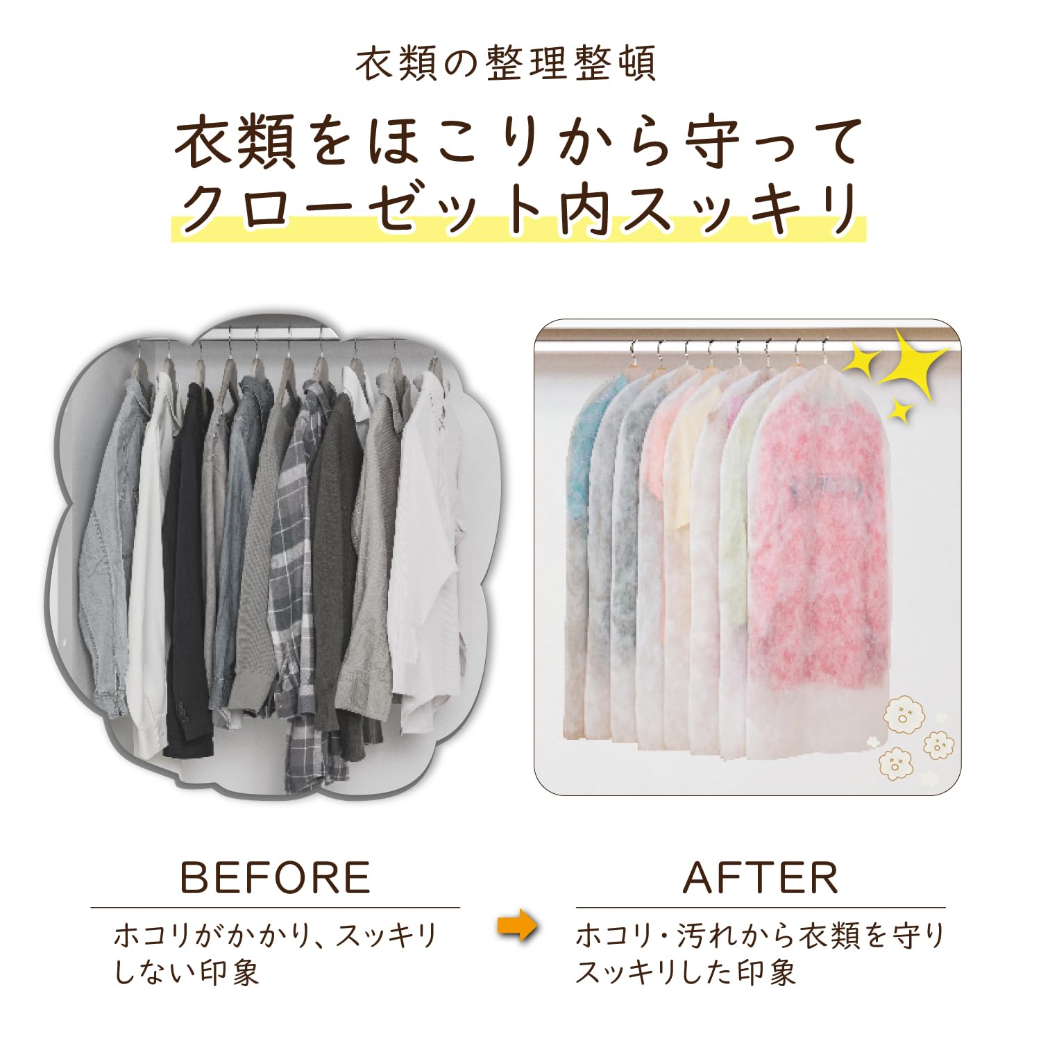通気性に優れた不織布製:空気がこもるのを防ぎながら、大切な洋服をホコリなどの汚れからガードします。