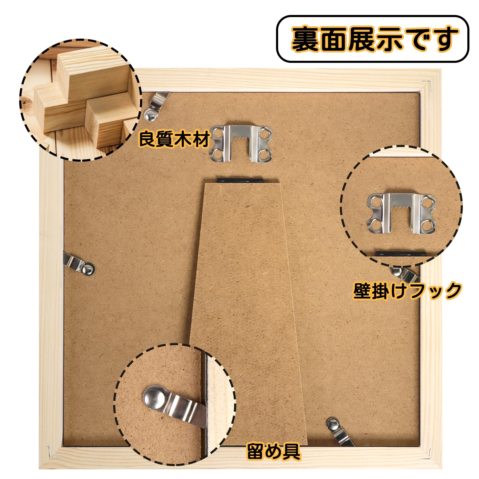 スクエア写真たて:枠の材質は木製を使用しており丈夫で軽くて使いやすい。スタンド機能と吊り下げるの両用ある。