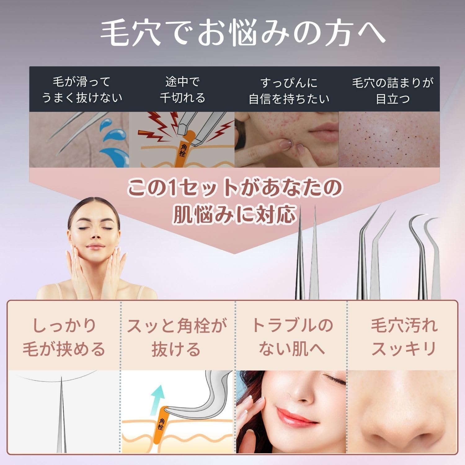 【この1セットがあなたの肌悩みに対応】 鼻周りの黒い汚れ・極細の産毛、毛穴の角栓までスッと抜ける!病みつきになる抜け心地です。肌の状態や用途に合わせて使用できる角栓取りピンセット。形状の違うツールで的確に処理できます。