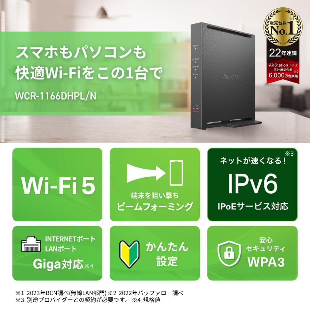 バッファロー WiFi ルーター 無線 LAN Wi-Fi5 11ac ac1200 866+300Mbps IPv6 WPA3 デュアルバンド 日本メーカー 【 iPhone 16e / 16 / 15 / 14 / Nintendo Switch / PS5 動作確認済み 】 エコパッケージ WCR-1166DHPL/N
