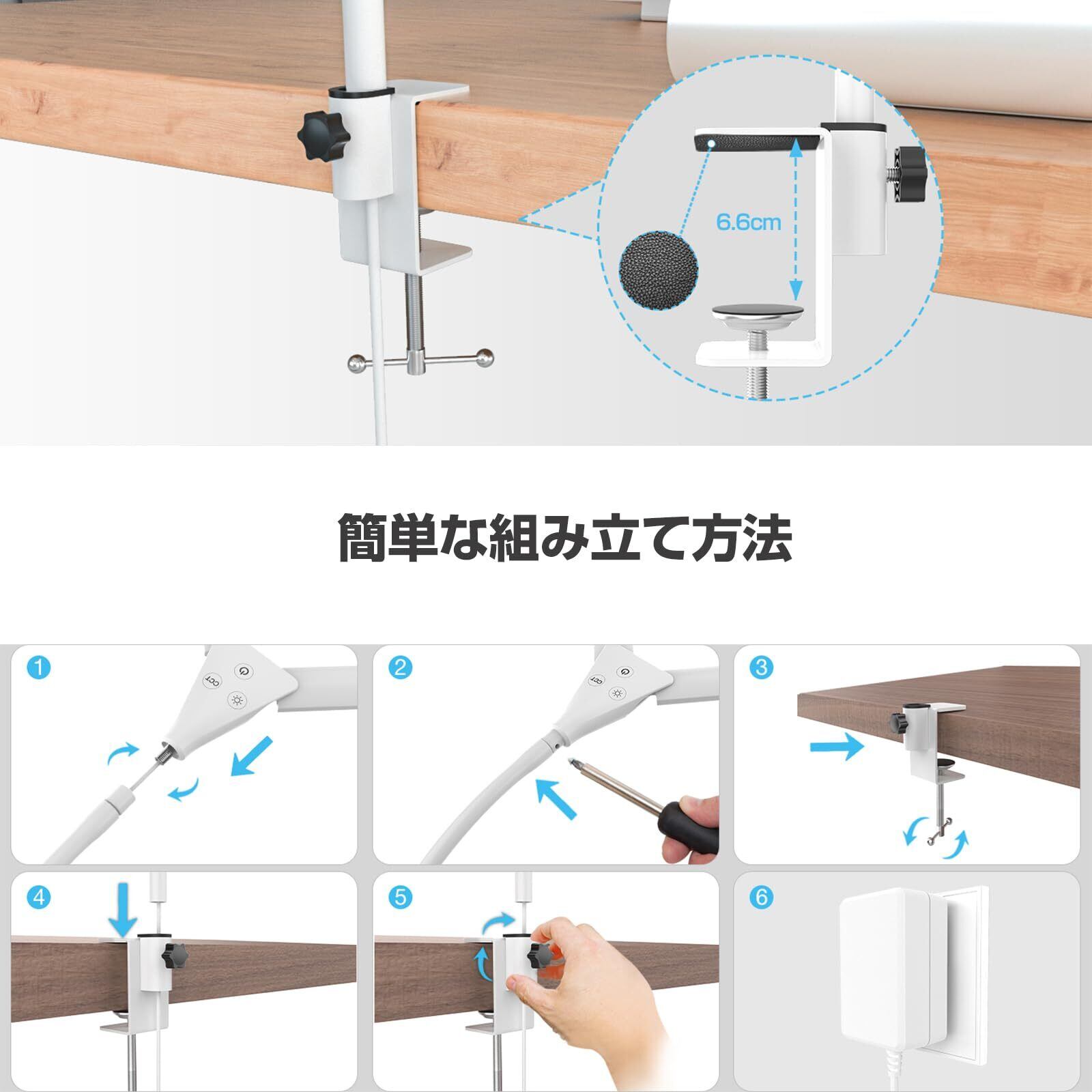 【クランプ式・省スペース・角度調整可】場所を取らないクランプ式のテーブルライト、教科書や参考書をたくさん広げる人や机が狭い人でも広々と作業できます。(クリップ挟める厚さ:6cmまで)。照らす位置を調整しやすい、グースネックデザイン、任意の角度に調整可能、ライトの設置場所を変えずとも照らしたい場所を照らせます。