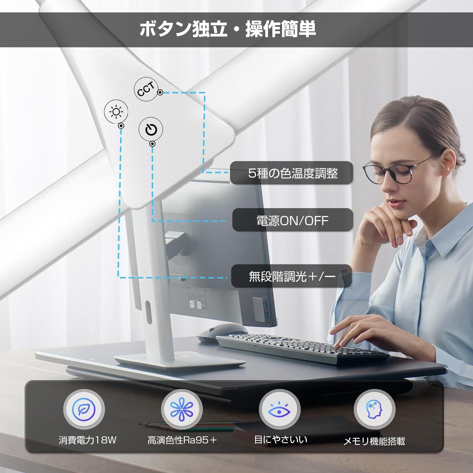 【Ra95高演色性・目に優しい】ダブル光源、高輝度広い照射範囲デスクランプなので、フリッカーなし、演色性がRa95+でより自然で鮮やかに見える高演色のデスクライトなので、目への負担が少ない、長時間の作業や読書にも疲れにくいです。自宅用だけでなく、オフィス用にもオススメ。