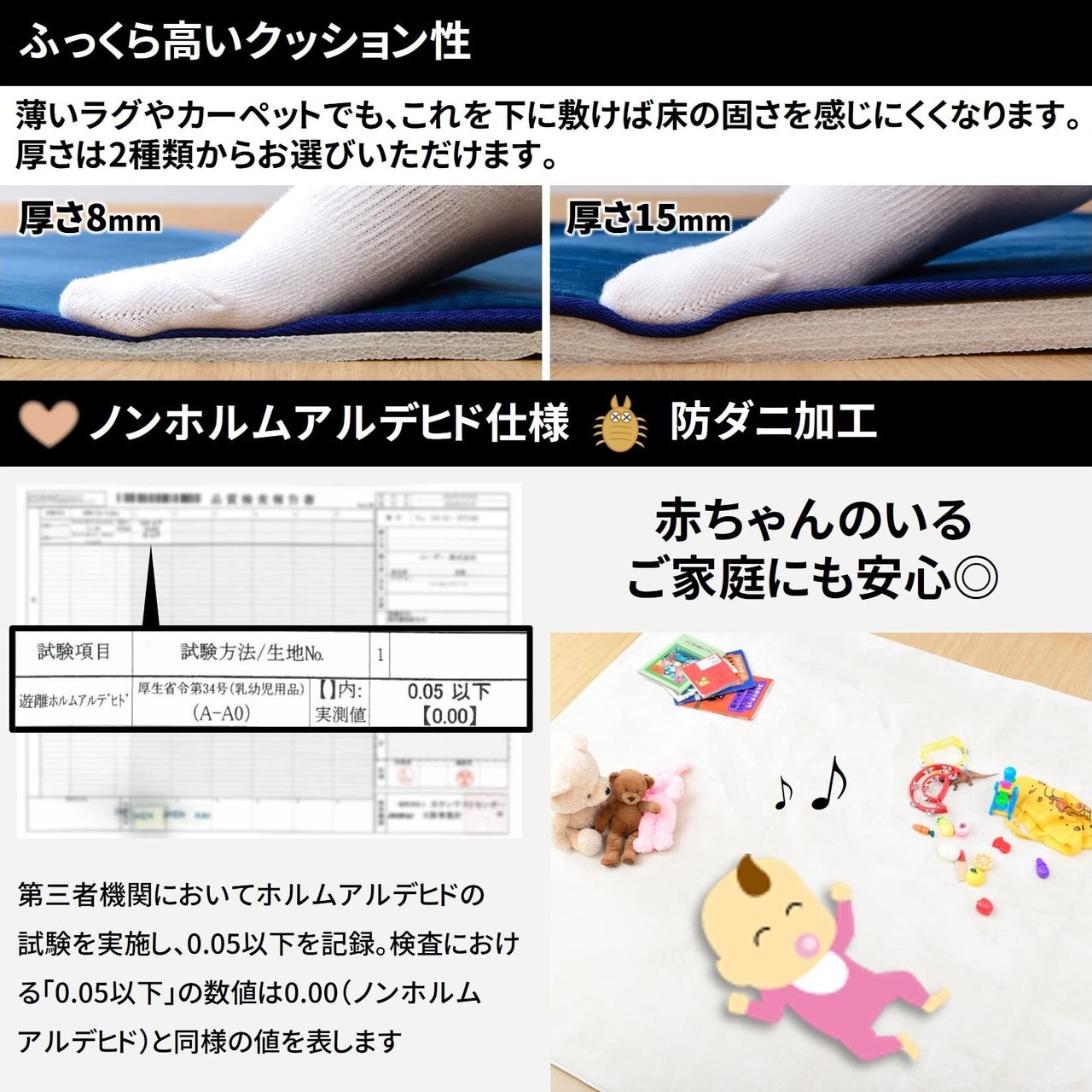 クッション性が高く、やわらかい踏み心地になっています。ラグやカーペットの下に防音マットを敷いてもダニが繁殖しにくいよう、防ダニ加工を施しております。また、ノンホルムアルデヒド仕様で、小さなお子様がいる家庭でも安心してご使用いただけます。※第三者機関においてホルムアルデヒドの試験を実施し、0.05以下を記録※検査における「0.05以下」の数値は0.00(ノンホルムアルデヒド)と同様の値を表します