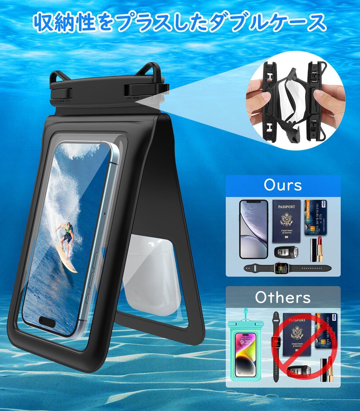 「収納性にプラスしたダブルケース仕様」スマホを装着するケース以外にもう一つのケースを設けてあり、同じくスマホも収納できる他、貴重品のクレジットカード、現金、鍵などの小物もスマホと共に身元に保管できるダブルケース仕様に仕上がっております。貴重品の紛失に心配いらなくなり、より快く水遊びをお楽しみいただけます。