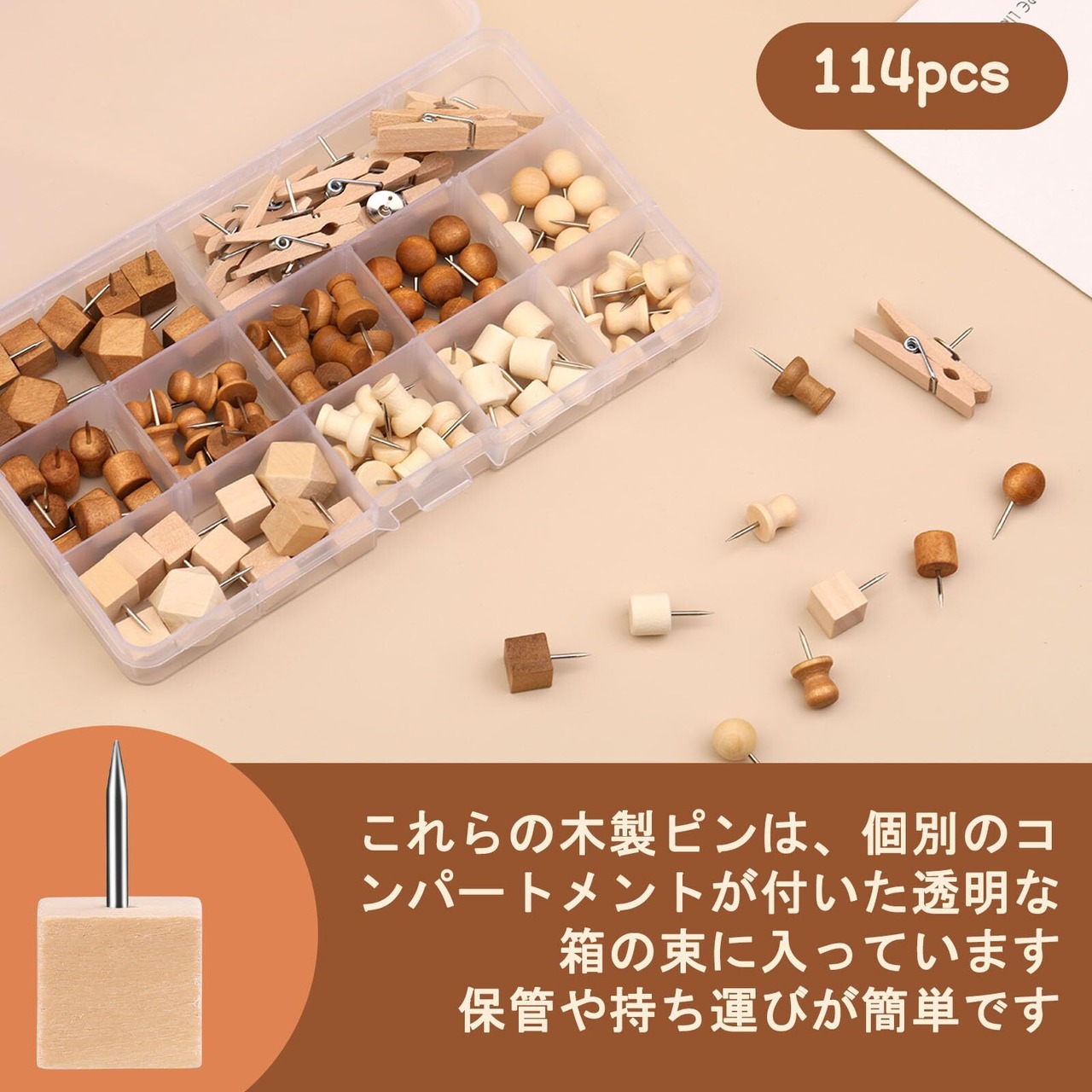 114個 木製 画鋲 装飾用木製ヘッドピン 7種類 クリップ 画鋲 クリップ 押しピン オフィス 学習 固定用 掲示板や工作用 収納ボックス付き (混合色)